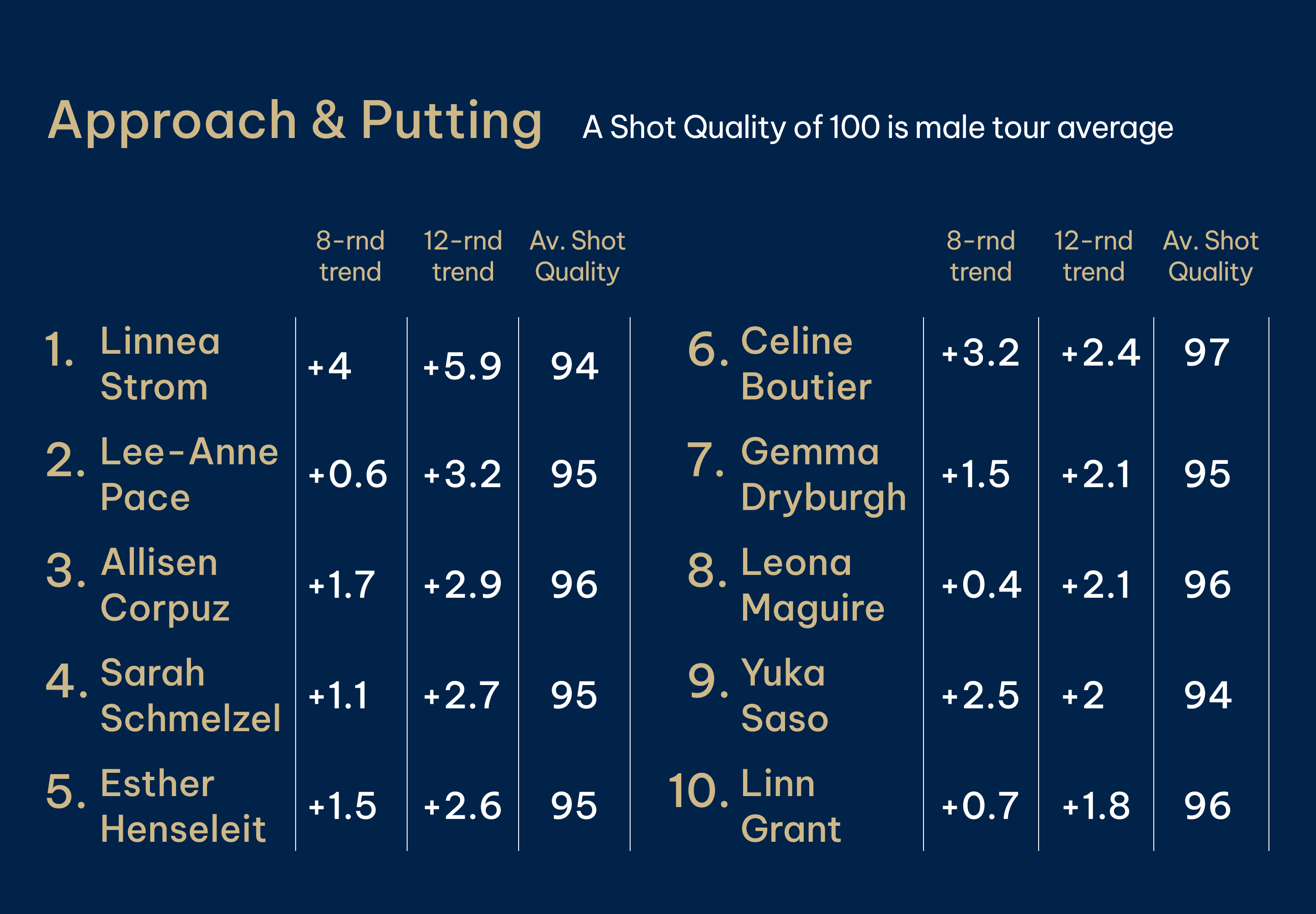 Here are the 10 players in the top 40 according to our own rankings who are trending in a combination of approach and putting, the two most important categories we have identified for the AIG Women’s British Open.