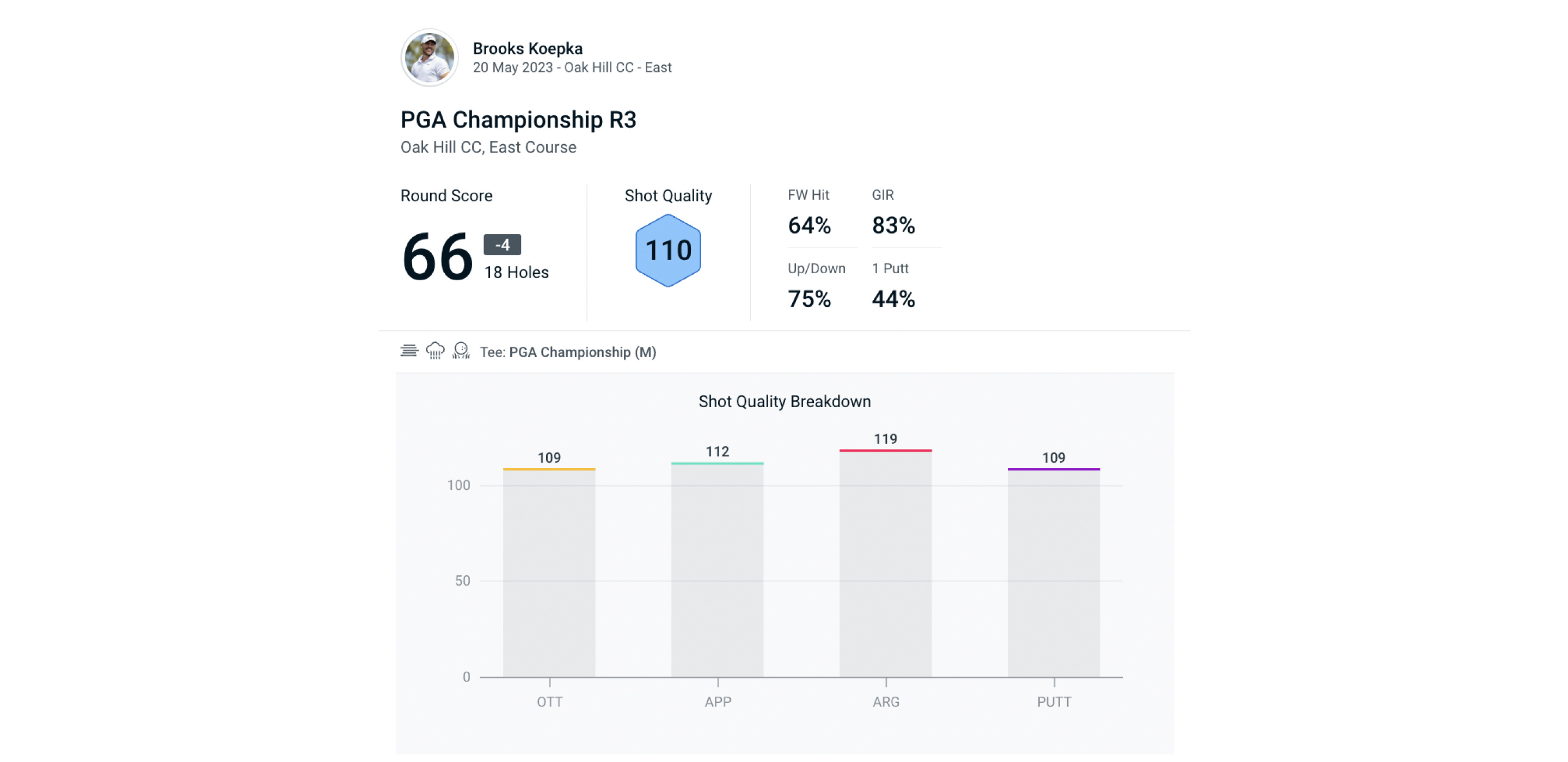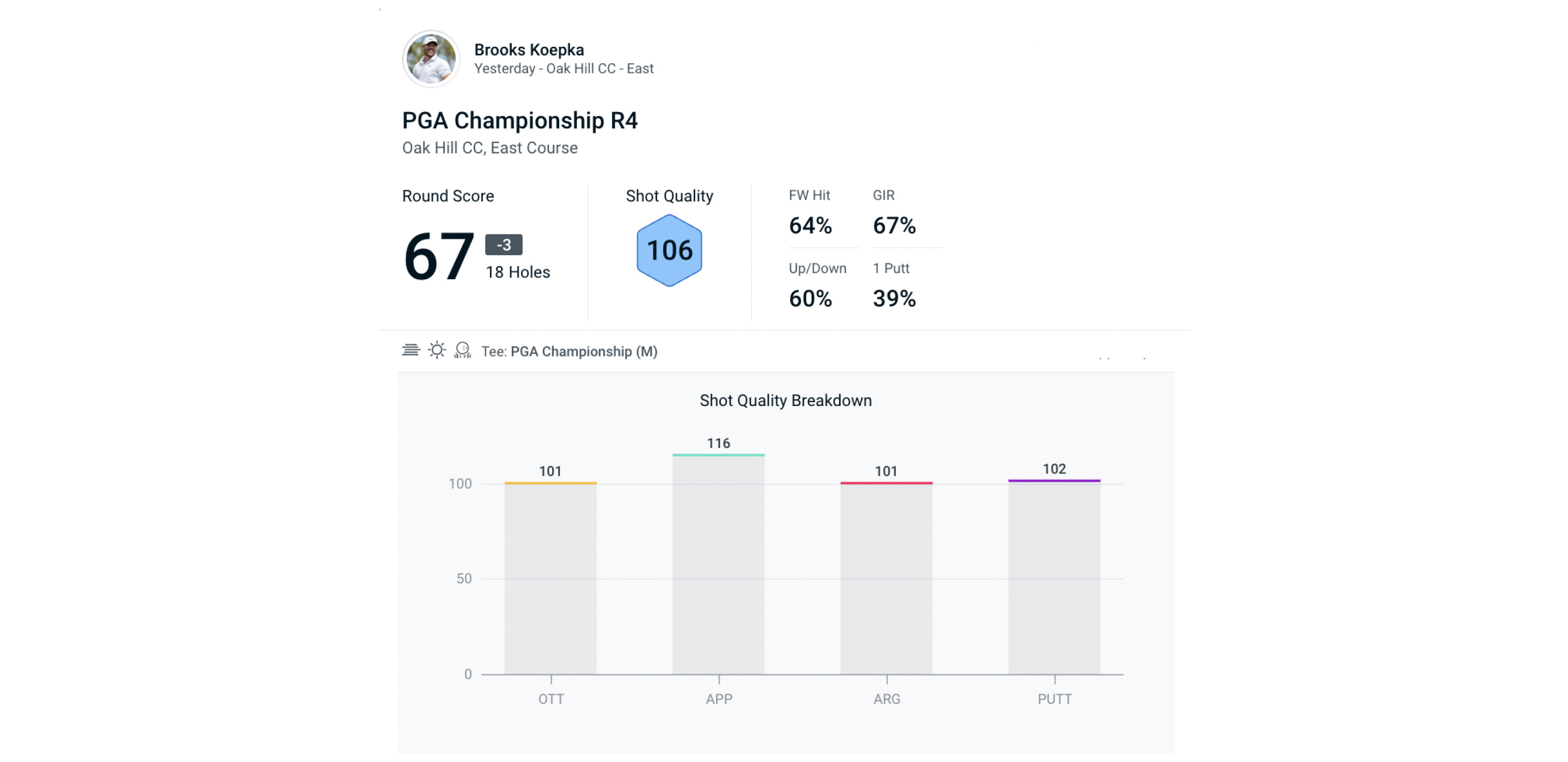 After tapping in for a two-stroke victory, Koepka said he was “in control all day”. In fact, he was in control from day two onwards. He only hit three bad shots (Shot Quality of 0-40) in the final 54 holes of the tournament, which is some feat on a golf course as exacting as the remodelled East Course at Oak Hill.