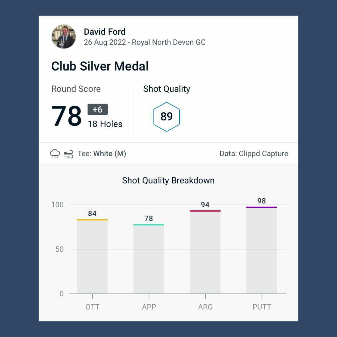 One of Clippd’s first ever users, Oli is a greenkeeper at RND and a very fine golfer and therefore used to seeing high Shot and Player Quality numbers. But this particular round was exceptional, even by his standards. After waking up at 4:30am to start his greenkeeping duties, Oli showed no signs of tiredness, going out in 31 and returning in 35 without a single blemish on the card. Not surprisingly he finished in pole position.
