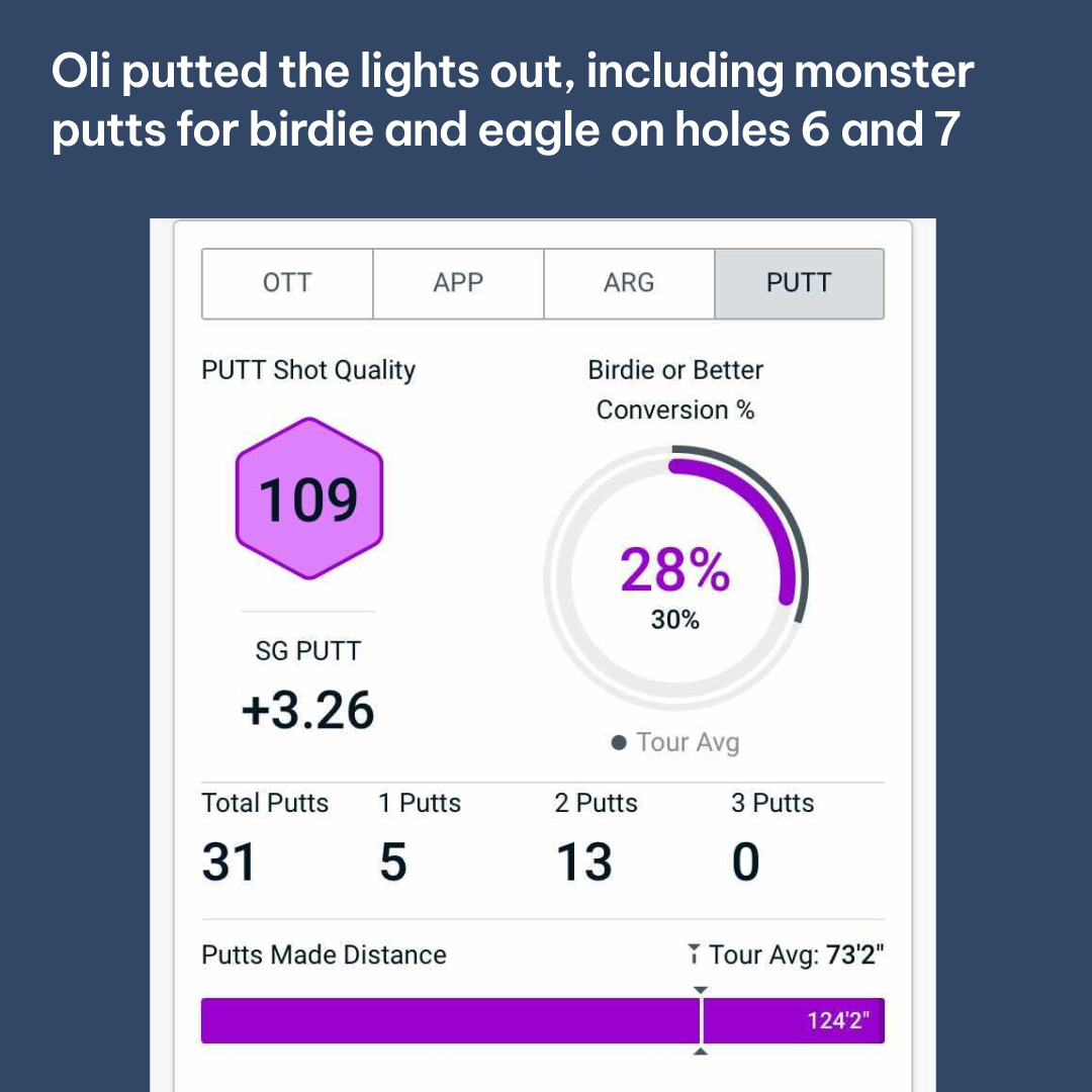 Oli is renowned for his putting and his silky touch was on display throughout. A Putts Made Distance of 124’2” (Tour Average is 73’2”, see above) alongside no three putts on hard, fast greens tells its own story. It also meant he was able to make the most of the good positions he put himself in. “The putt on 7 was that far away I didn’t have the nerve to raise the putter.”