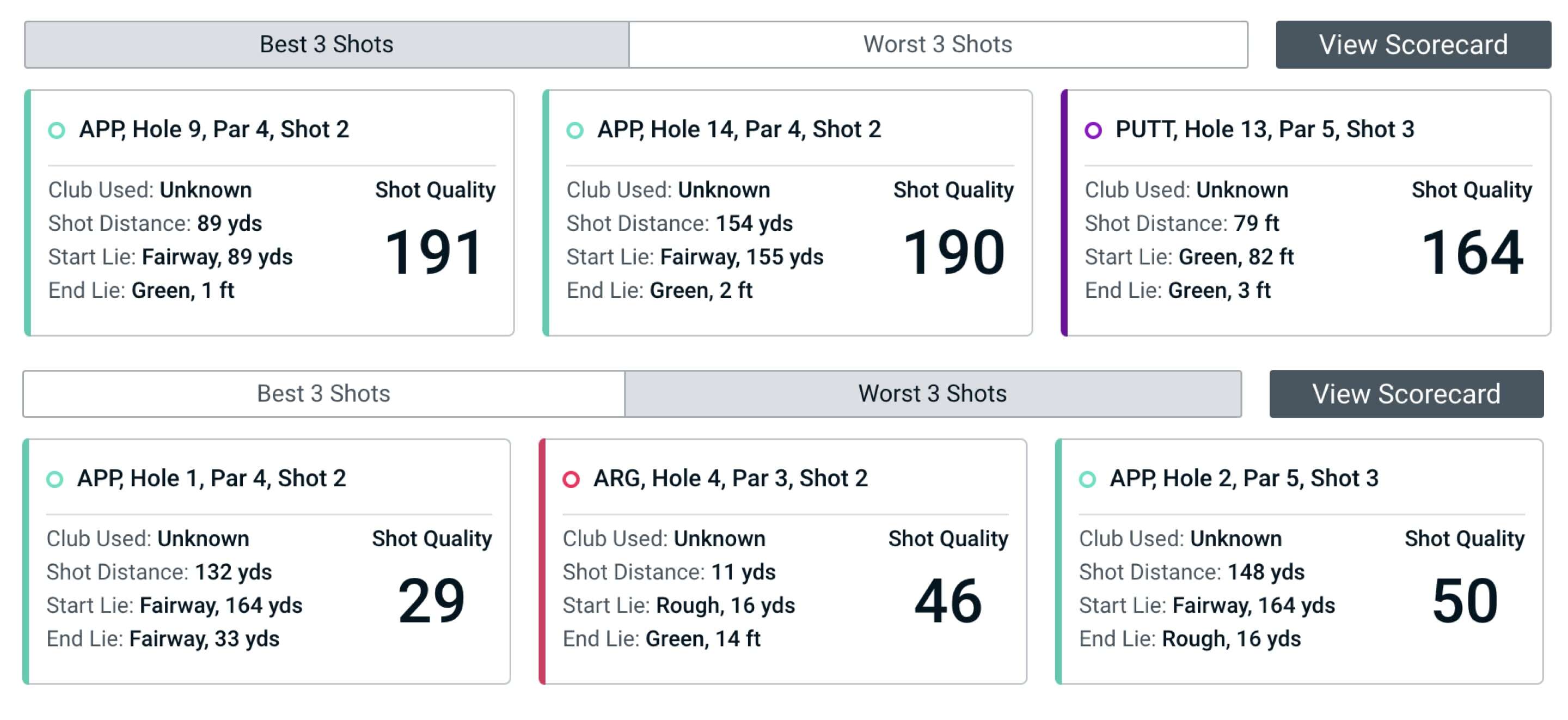 See your three best and worst shots from the round, based on their Shot Quality scores. Remember, a Shot Quality score of 100 represents male tour average, while 200 represents statistical perfection, like a hole in one or holing out from a difficult spot. For comparison, a 10 handicap golfer is expected to have a Shot Quality score of 59 for their approach shots.