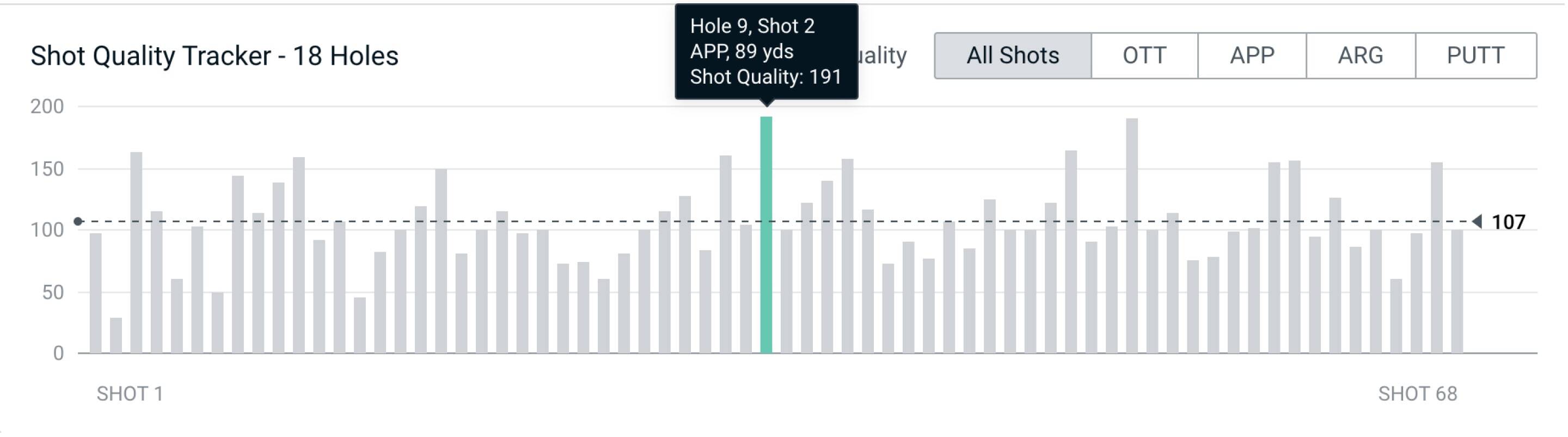 The Shot Quality Tracker is an indicator as to how you performed over a round. It’s a quick and easy way to see where the momentum came and went. It shows every shot and tapping on a bar will give you the Shot Quality number and brief details for that shot.