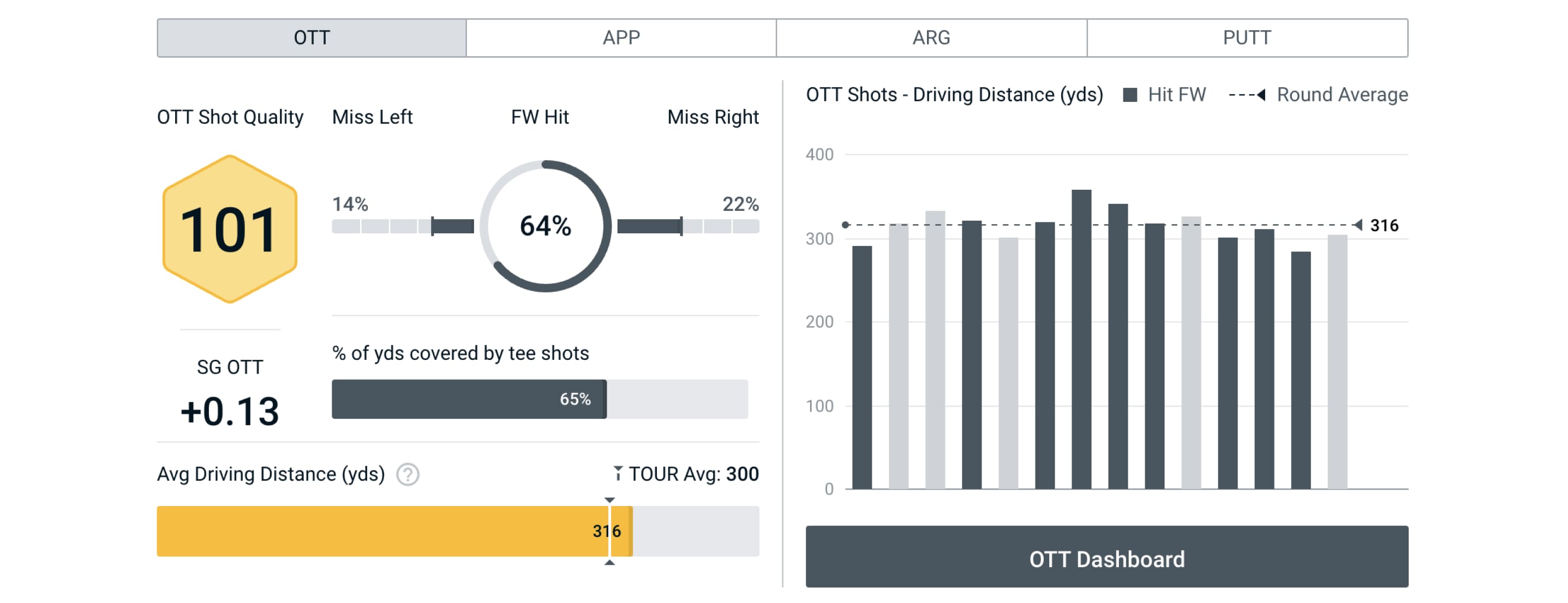 You can get a more detailed view for each area of your game in the round. There are relevant stats for each area such as average driving distance for Off The Tee (OTT) or the total putts made distance for putting (PUTT).