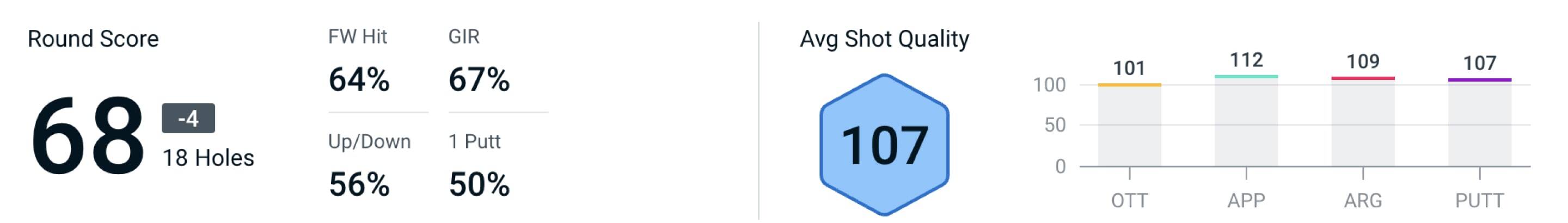 The first thing you see is an overview of your round, which includes your score, basic statistics such as GIR and your Average Shot Quality breakdown for each area of your game. Remember, a Shot Quality of 100 is the quality expected of a male tour player. You can see that Scottie was above that average in each area of his game, especially Approach which is vital for success at Augusta National. His Average Shot Quality of 112 meant he was a full 12% better than tour average.
