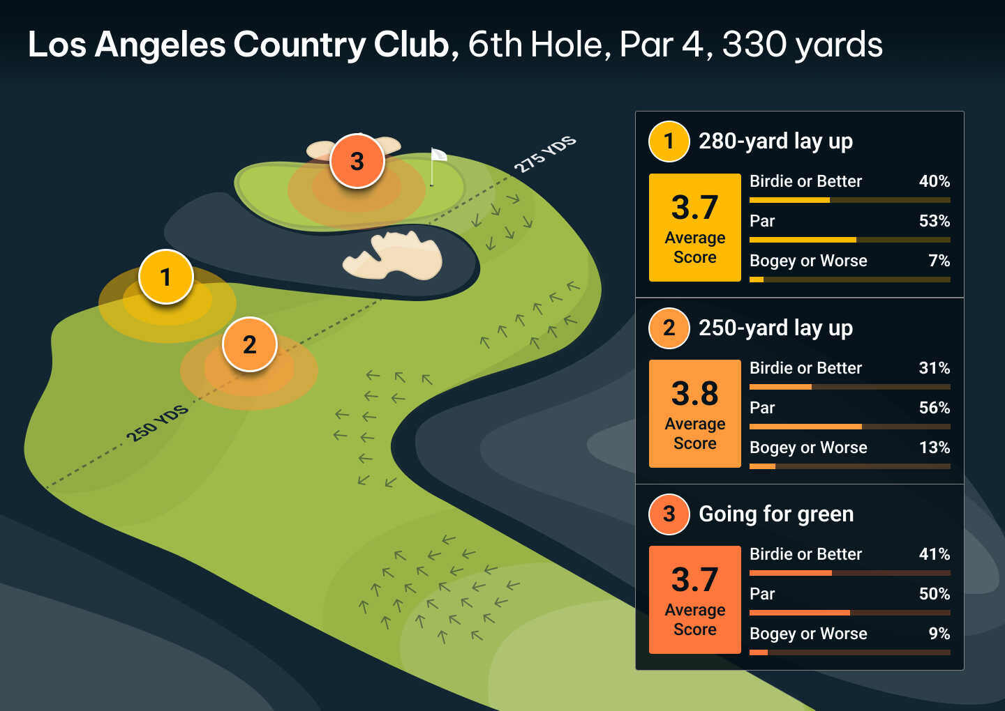 In comparison to this strategy, the likelihood of birdie is increased when going for the green, but so too is the likelihood of a five or worse. The 250-yard layup to the centre of the fairway is the worst of the three options, producing the highest average score when played to a far right pin position.