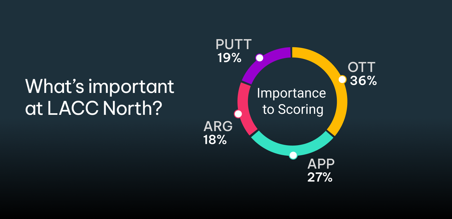 In terms of what a blueprint for success at LA Country Club might look like, Digital Twin ranks the following skills in terms of importance to scoring: 1. Off The Tee 36%; 2. Approach 27%; 3. Around The Green 18%; 4. Putting 19%.