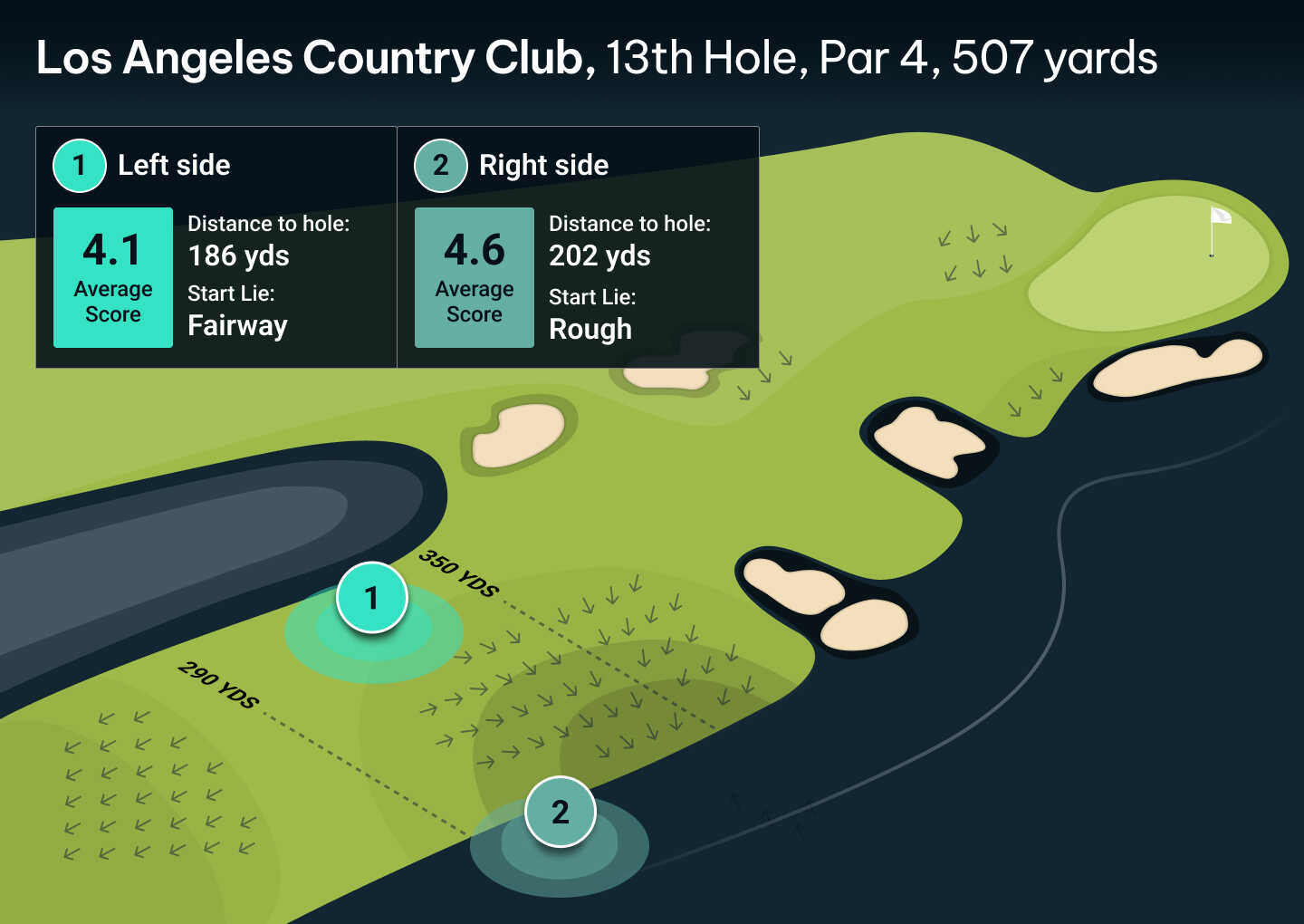 Verdict: Clippd’s Digital Twin underlines just how important it is to find the funnel on the high side of the fairway. It will give players more than half a shot advantage on those whose drives are gathered by the swale and ushered into the rough to the right of the fairway.