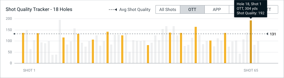 It’s no secret that Jon Rahm’s OTT game is up there with the very best in the world. His current Player Quality for OTT is 114 (Tour Top 25 is 115) and is getting back to where he was earlier in the year. During round 3, his OTT Average Shot Quality was a staggering 131 (he hit 64% of his fairways and averaged 327 yards). His highest scoring OTT shot for the tournament came during the 3rd round where he hit his 18th tee shot onto the green to 21ft resulting in a Shot Quality of 192.