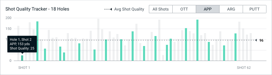Rahm’s APP Player Quality is currently at 105 (Tour Top 25 is 112), which is his lowest scoring department. It was also his lowest scoring department for the tournament. In the 4th round his Average Shot Quality for APP was 96, which included 11/19 shots scoring below 100. This clearly didn’t hurt him too much as he went on to shoot a 9-under-par 62. His best APP shot of the tournament came during the final round when he hit the pin from 208 yards away on the par 5 14th, finishing 5ft away. It was a stroke that scored a stunning 192 for Shot Quality.