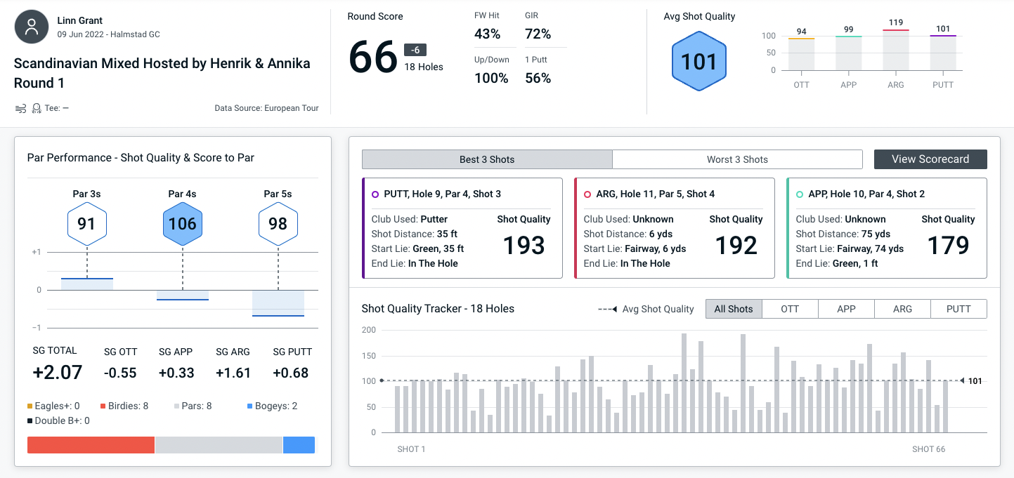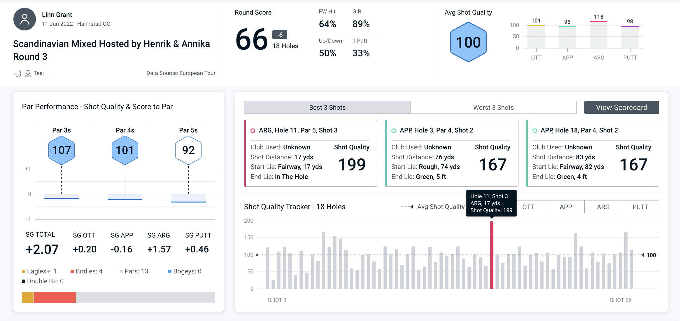 Her impressive short game continued into her third round 66 where she finished with an Average Shot Quality of 118 for ARG. Linn narrowly missed out on becoming a member of Clippd’s 200 Club when she a holed a chip shot from 17 yards, scoring 199 for Shot Quality (see below).
