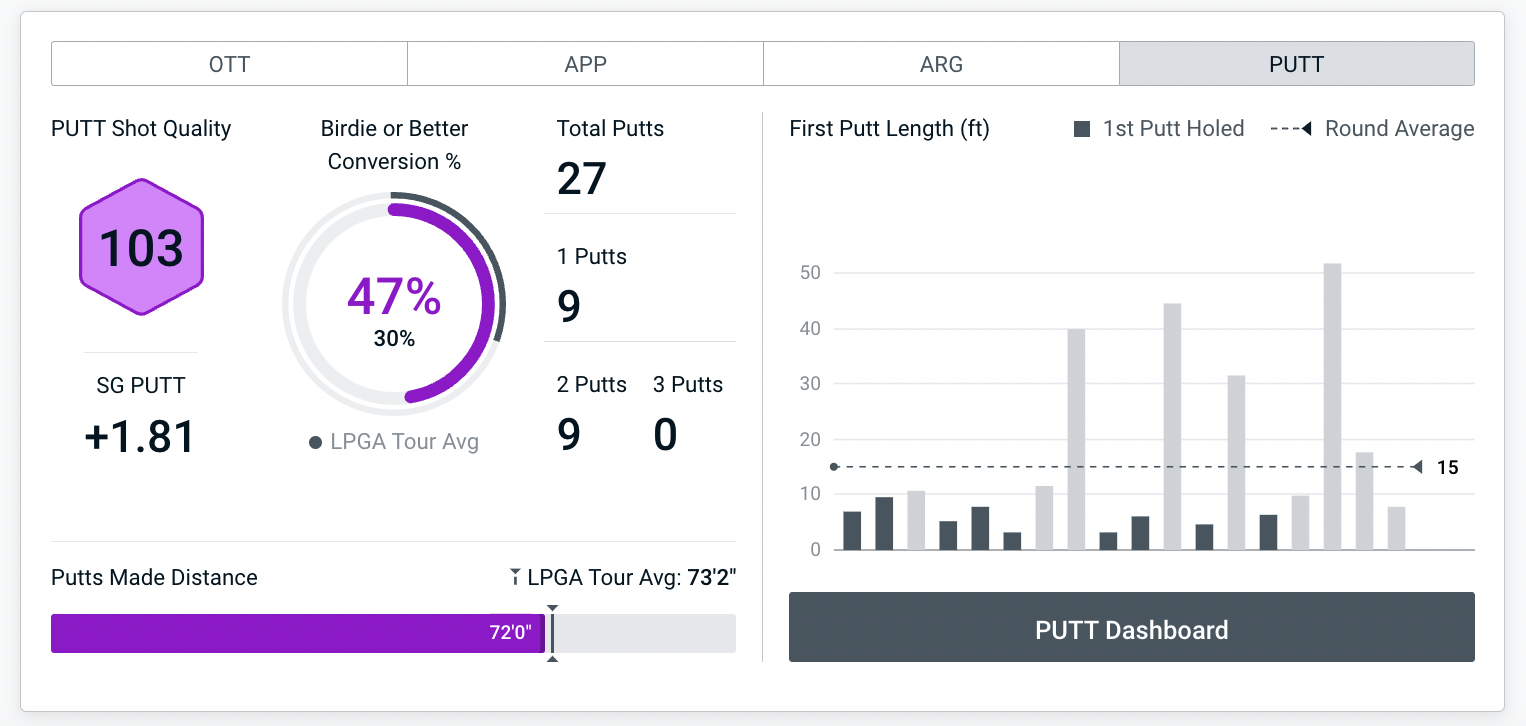 Her APP (Approach) play during her last round was especially sharp, scoring an Average Shot Quality of 106. Six out of the 15 approach shots she hit achieved Shot Quality scores of over 130. Her average proximity to the hole was 34’ 1”, almost four feet closer than the LPGA and PGA Tour averages (see below). She also hit no shots that scored below 40 for Shot Quality, something that had us double checking the data because it's so rare.