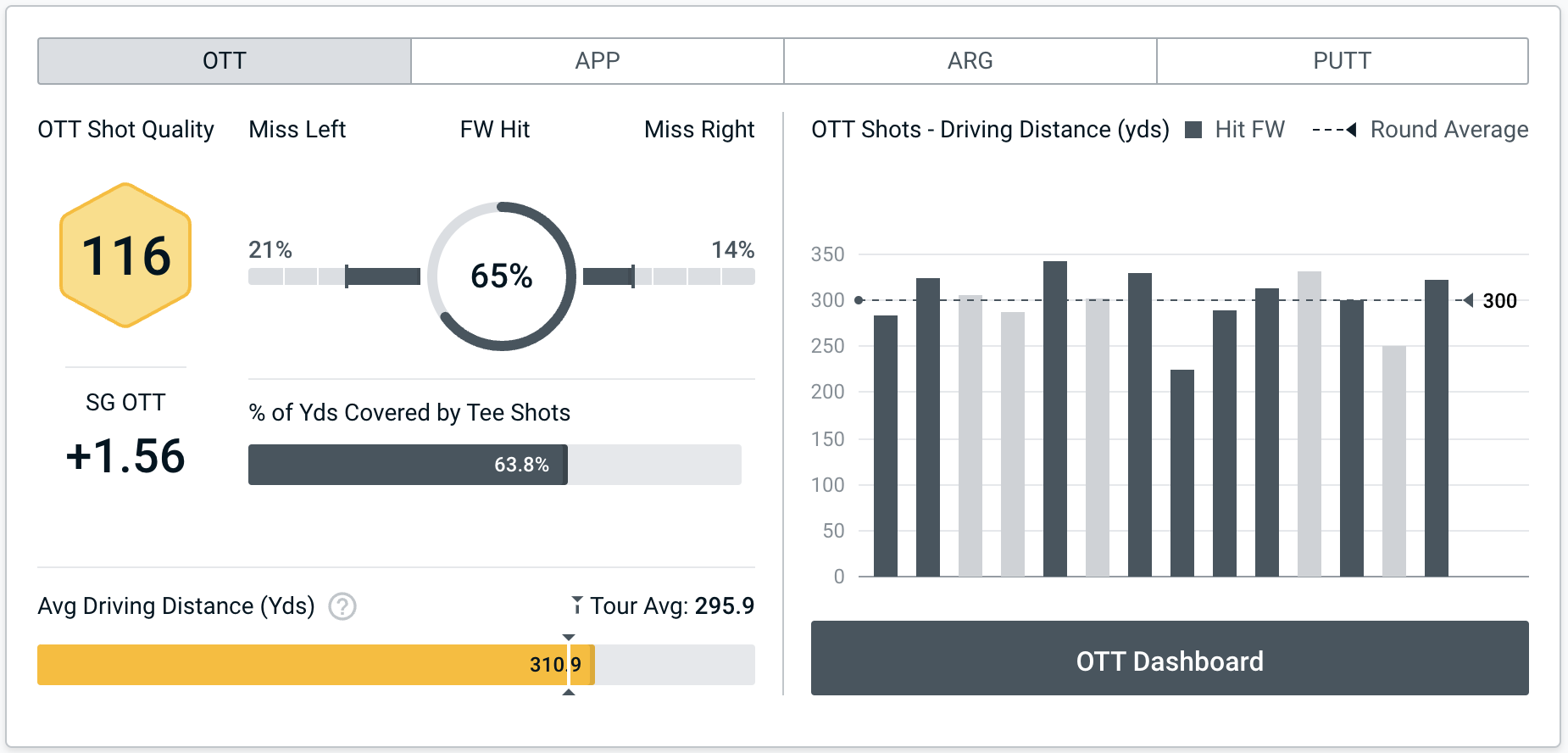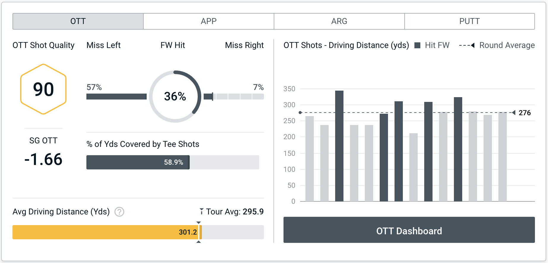 Much is made of how far tour players bomb the ball these days. Looking at Mardy's OTT data however, it's clear he's up there with some of the longer hitters out there. His average distance for round one was 301 yards for an Average Shot Quality of 90 whilst in round two he averaged 310 yards for an Average Shot Quality of 116. Remember, 100 is the Shot Quality standard expected of a tour player.