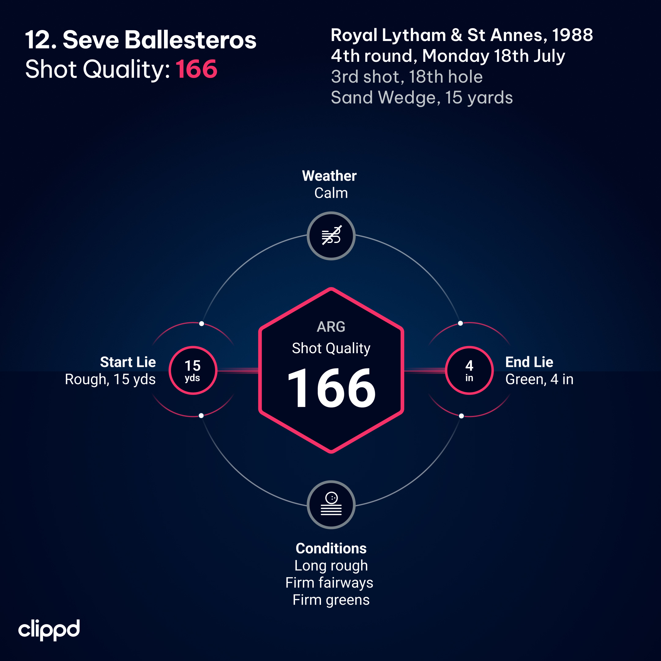 His drive was slightly pushed and his second shot found a hollow to the left of the green. The ball was not lying well but Seve knew exactly what to do. He popped the ball up and watched as it rolled across the green, kissed the edge of the hole and came to rest a matter of inches away. When Price failed to nail his birdie putt, Severiano Ballesteros Sota, who had closed with a 65, was confirmed as the Champion Golfer of the Year for a third time.
