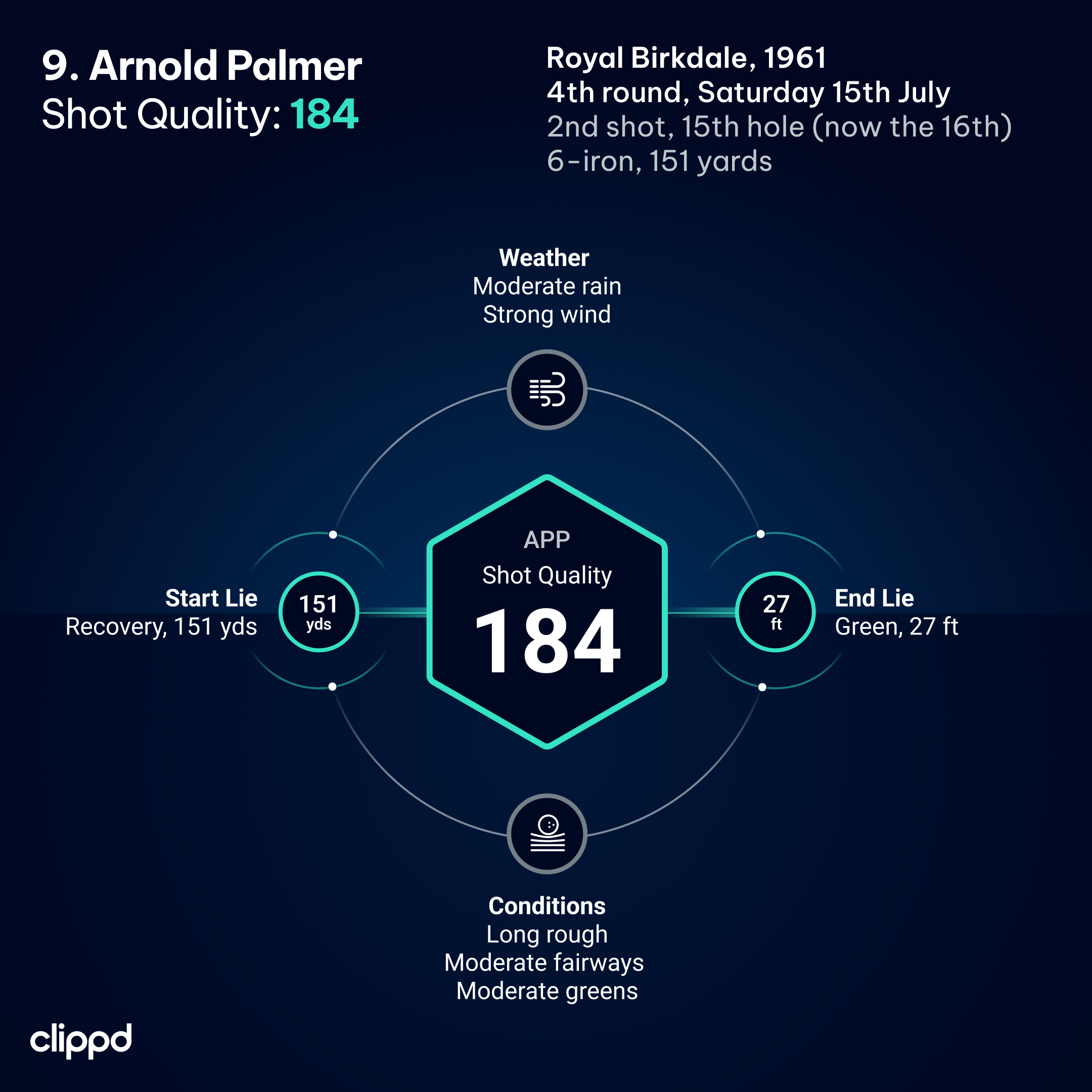 With Rees making three birdies to finish his round, the pressure was now on. Palmer reached for his 6-iron and swung with all his might. A huge divot, dust and assorted detritus flew into the air before the ball landed on the green 151 yards away, allowing him to two-putt for a vital par. “I saw the opening,” Palmer told The New York Times. “I was sure I would make it. Nobody else was.”