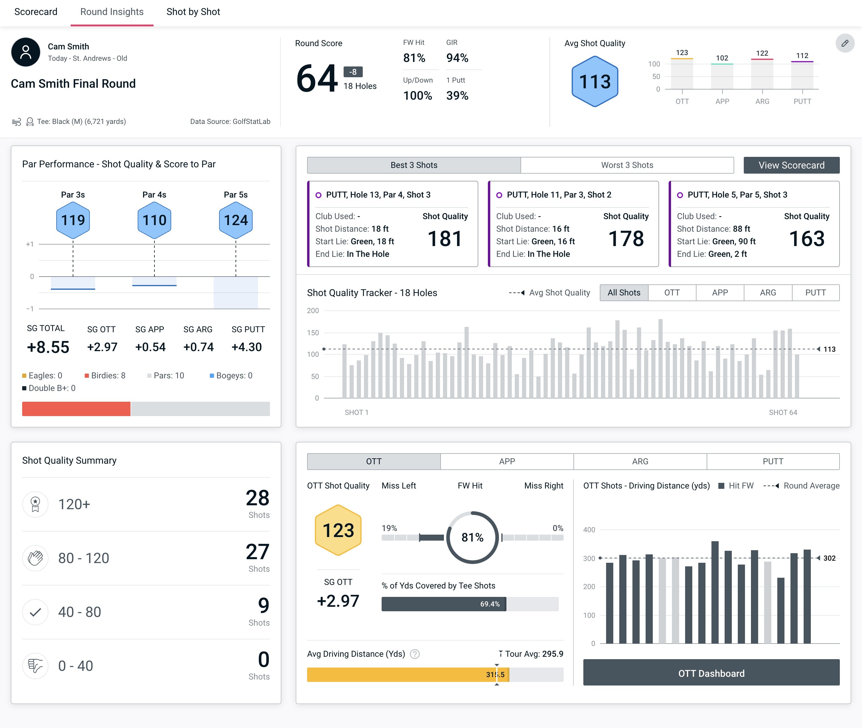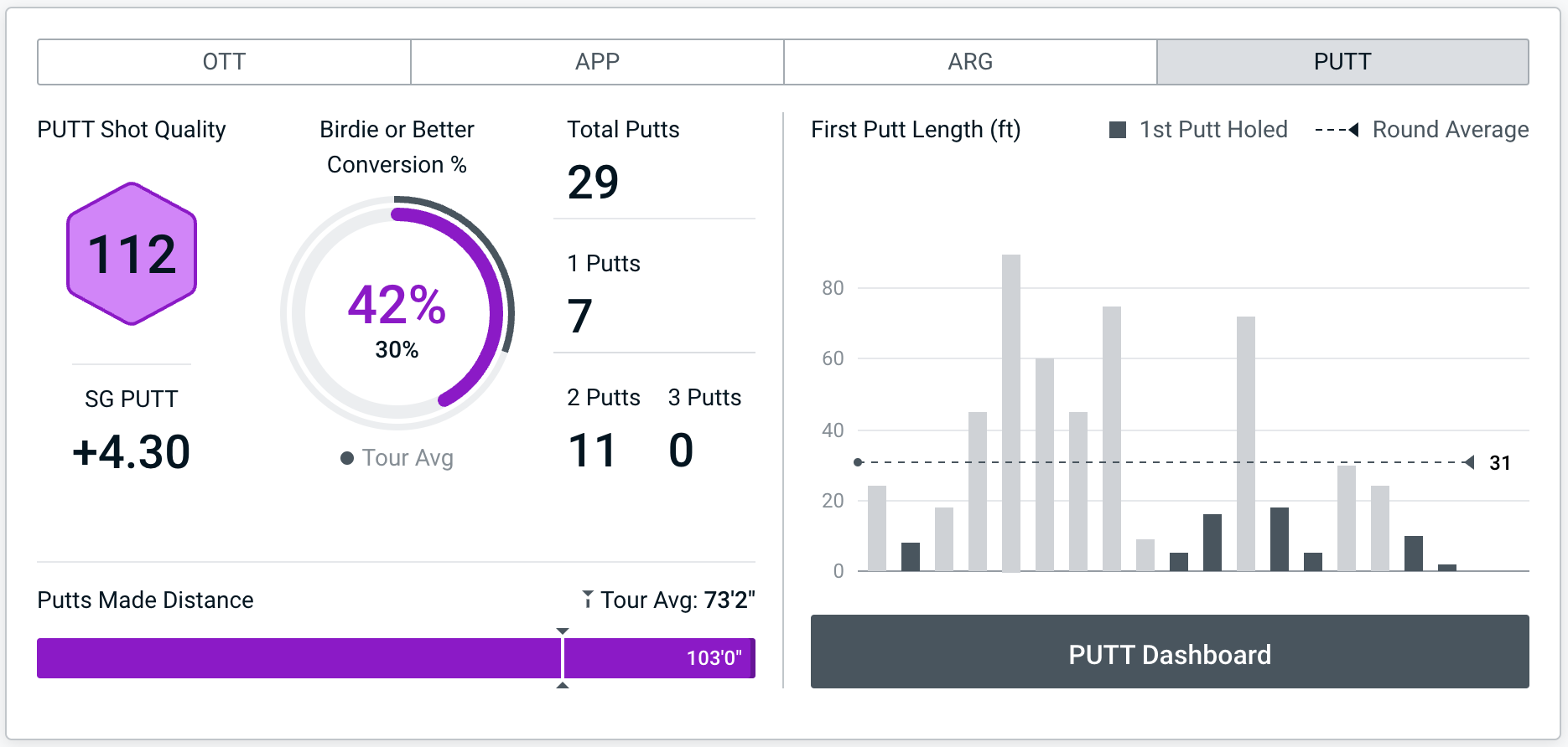 That putt scored a Shot Quality of 178 and contributed to his Average Shot Quality score of 112 for the round. In his next three holes, his lowest Shot Quality score with the putter was a phenomenal 161!
