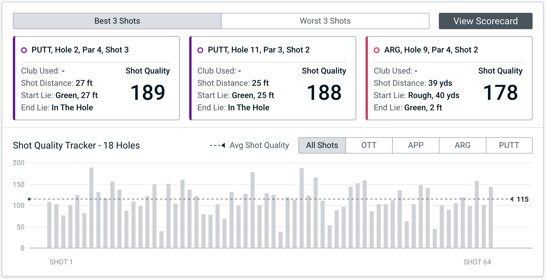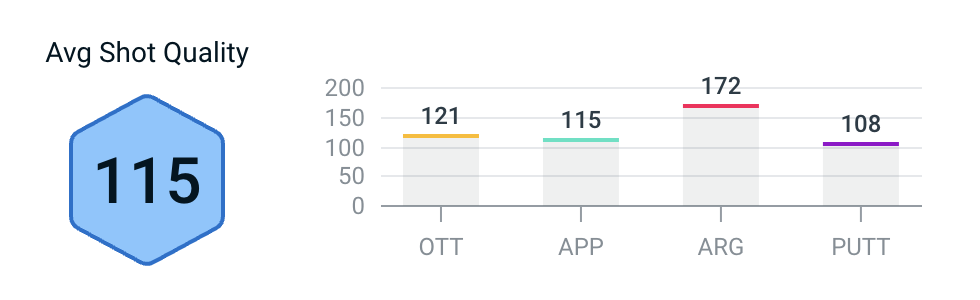 Note: Clippd's Shot Quality measures each individual shot, taking into account numerous factors that impact the difficulty of each shot. Shot Quality is represented as a number between 0 and 200, with 100 being the quality expected of a shot by a typical tour player and 200 representing “perfection”, such as a hole-in-one or a hole out from the fairway. Like Shot Quality, Player Quality is represented as a number between 0 and 200, with 100 being an approximation for tour standard.