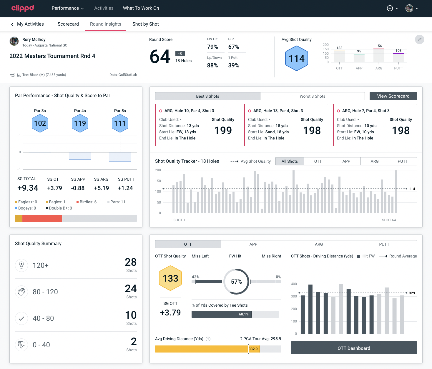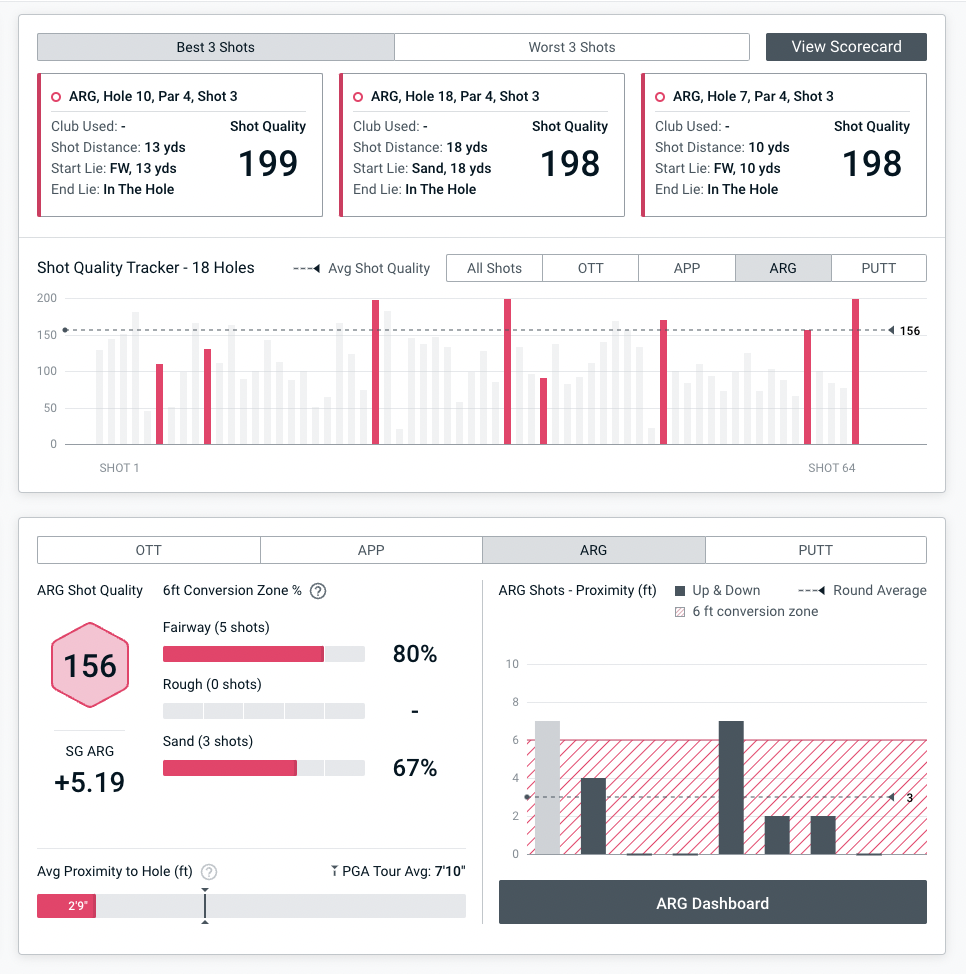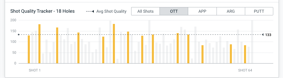 An Average Shot Quality of 114 tells its own story, while his 156 for around the green (ARG) was off the charts and the highest average Shot Quality we've seen for a single round. Three chip-ins, including an outrageous hole-out from the greenside bunker on 18, will do that for your numbers.