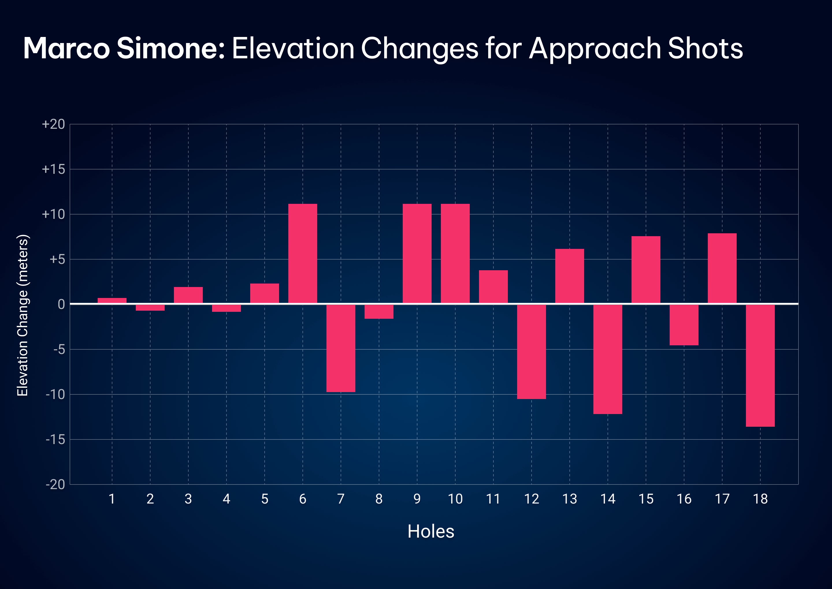 Eleven of the 18 holes at Marco Simone have changes in elevation for approach shots that are more extreme than seen on 80% of PGA Tour courses. The average absolute elevation change for approach shots on a PGA Tour course is 2.5 metres. The average absolute elevation change for approach shots at Marco Simone is 6.2 metres per hole.