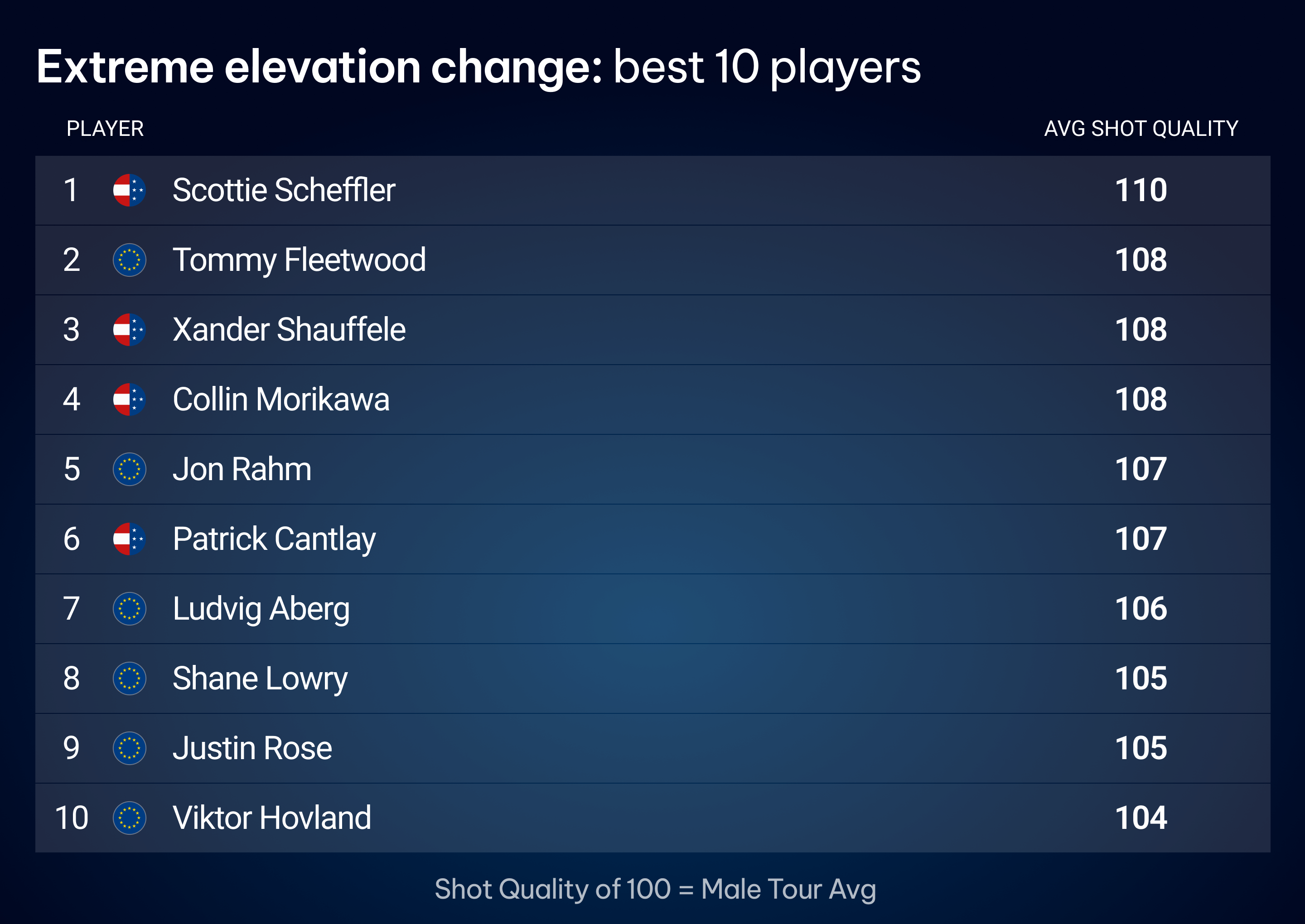 We have looked at Average Shot Quality for approach shots of more than 140 yards on holes with an absolute elevation change of more than 3.3 metres or 10 feet, which for these purposes we define as extreme. The sample is taken from PGA Tour and DP World Tour events since September 2022. A Shot Quality of 100 represents male tour average while 200 represents statistical perfection, such as a hole in one or holing out from long distance.