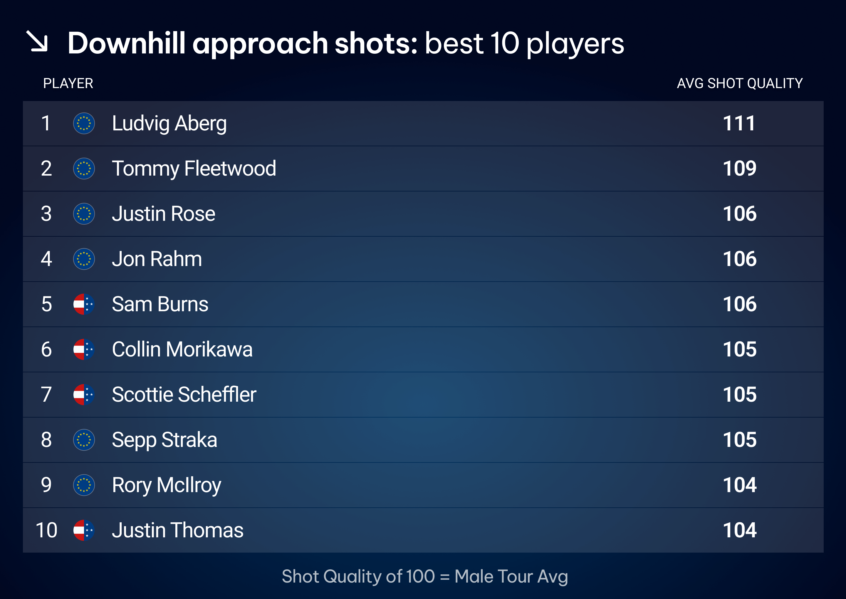 Europe also has an advantage in downhill approach shots (see below), with the top four players in the list and six of the top 10. This list points to Aberg, Fleetwood, Rose (who is a foursomes specialist) and Rahm being best matched to the second shots into holes 12, 14 and 18. Many will attempt to drive the 16th and if not, the approach is likely to be less than 80 yards.
