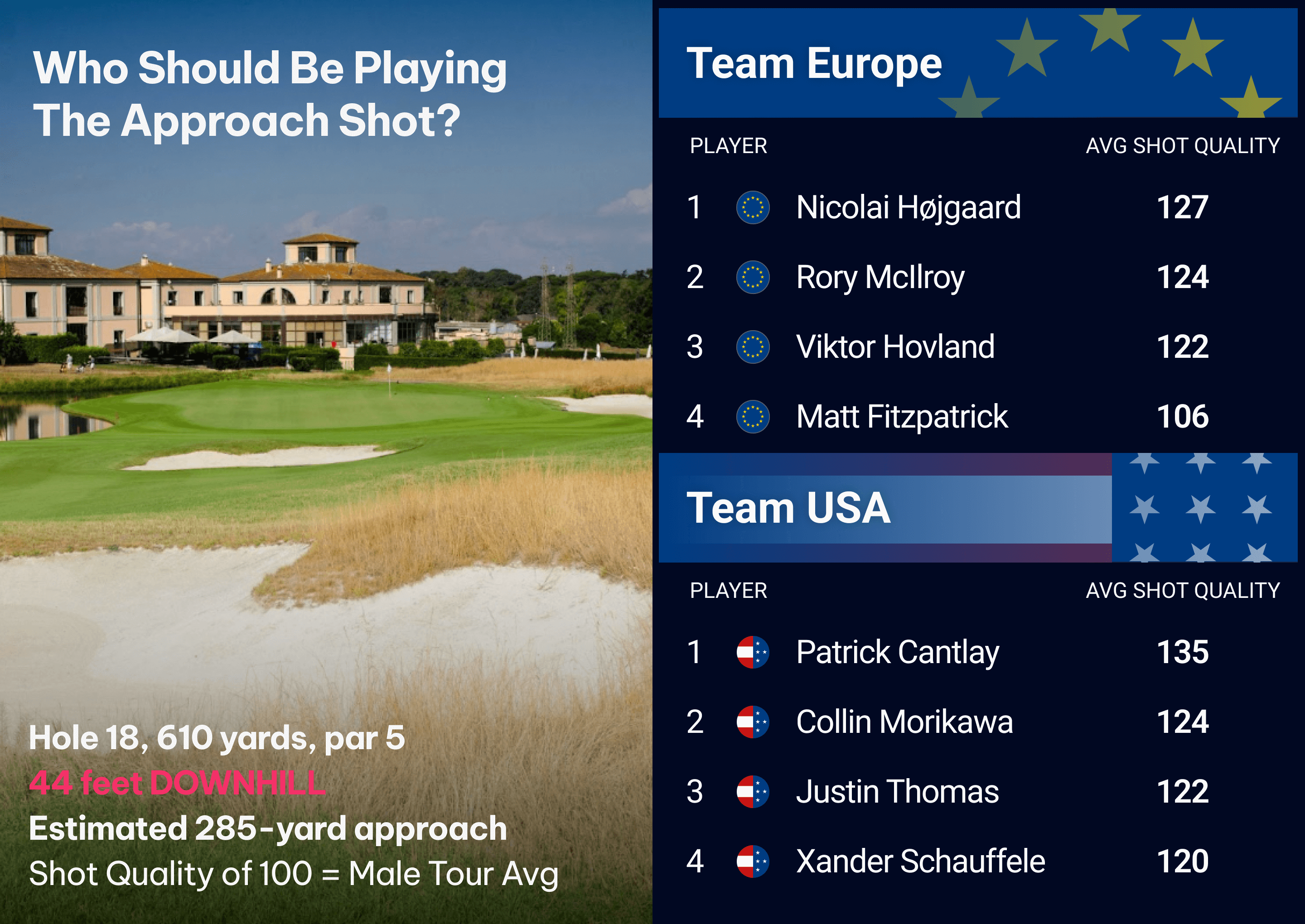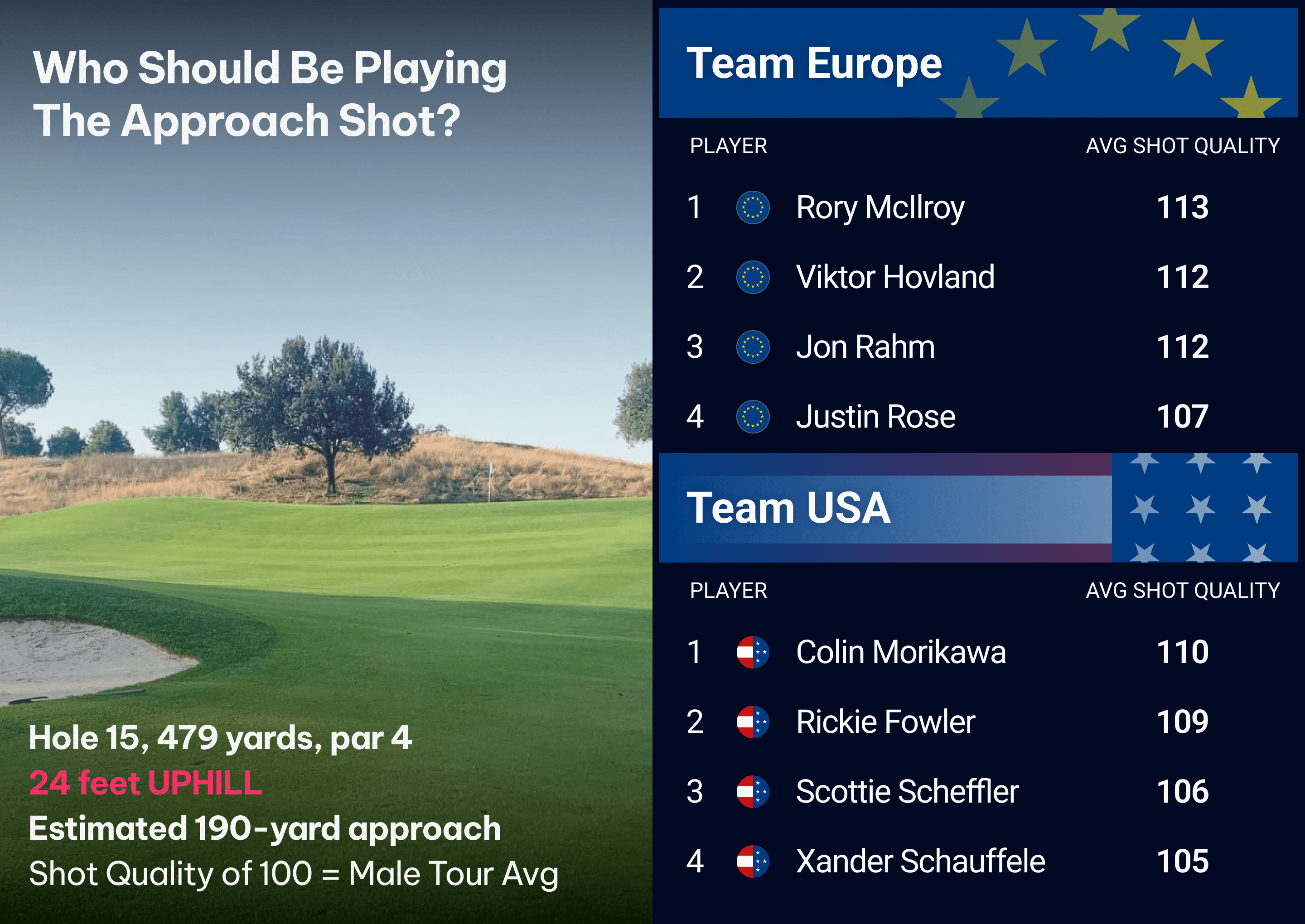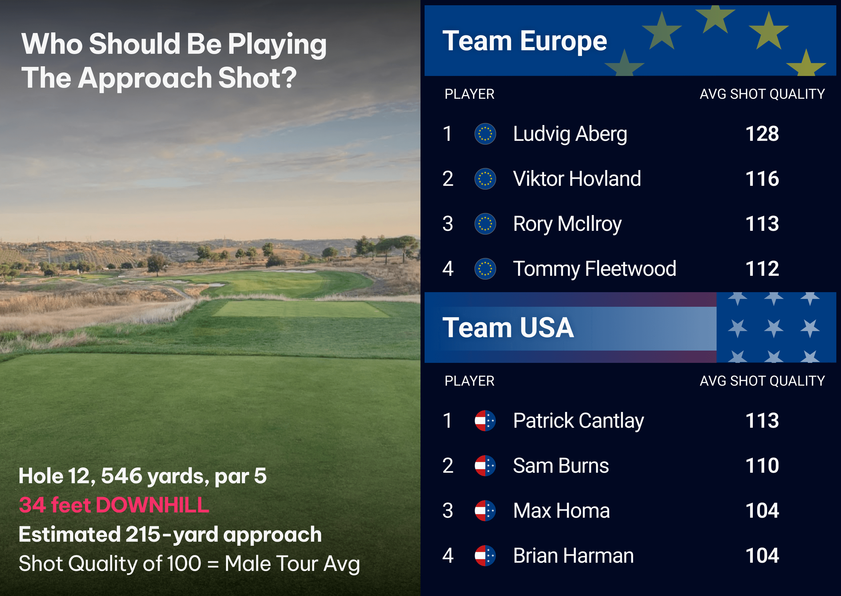 Collin Morikawa is the McIlroy equivalent on Team USA, being one of the top performers at both downhill and uphill shots but excelling in the likely approach distances required for 12 and 18, as well as the tee shot into the tough par-3 17th.
