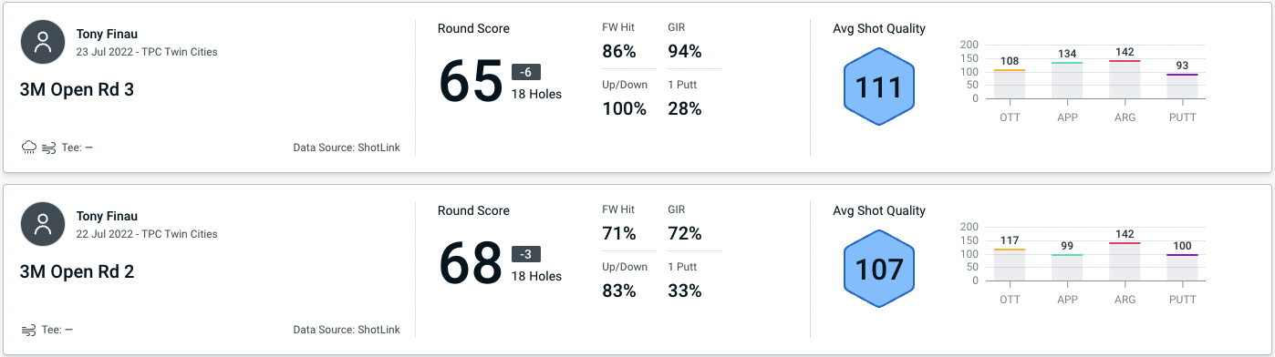 Across the two tournaments it was Finau's Around The Green (ARG) play that was most frequently the strongest part of his game. For rounds two and three of the 3M Open he recorded a staggering Average Shot Quality of 142 for his ARG play. This was also the department that had the highest single Shot Quality score across the two weeks – a chip-in for par on the 11th hole from the greenside rough during the third round at the 3M, which produced a Shot Quality score of 199.