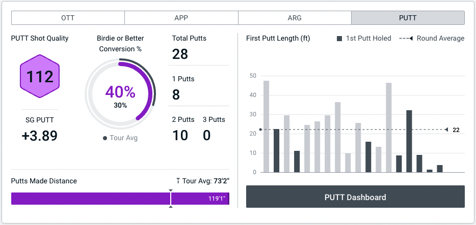 Although PUTT was technically speaking the American's weakest department in terms of Average Shot Quality, it certainly wasn't bad. He only had four three-putts for the two tournaments and two of these came in the first round of the 3M Open. His current overall Player Quality for PUTT is 101 (Tour top-25 level is 105), which means there is still room for improvement – worrying news for those hoping the Finau Express is about to slow down.