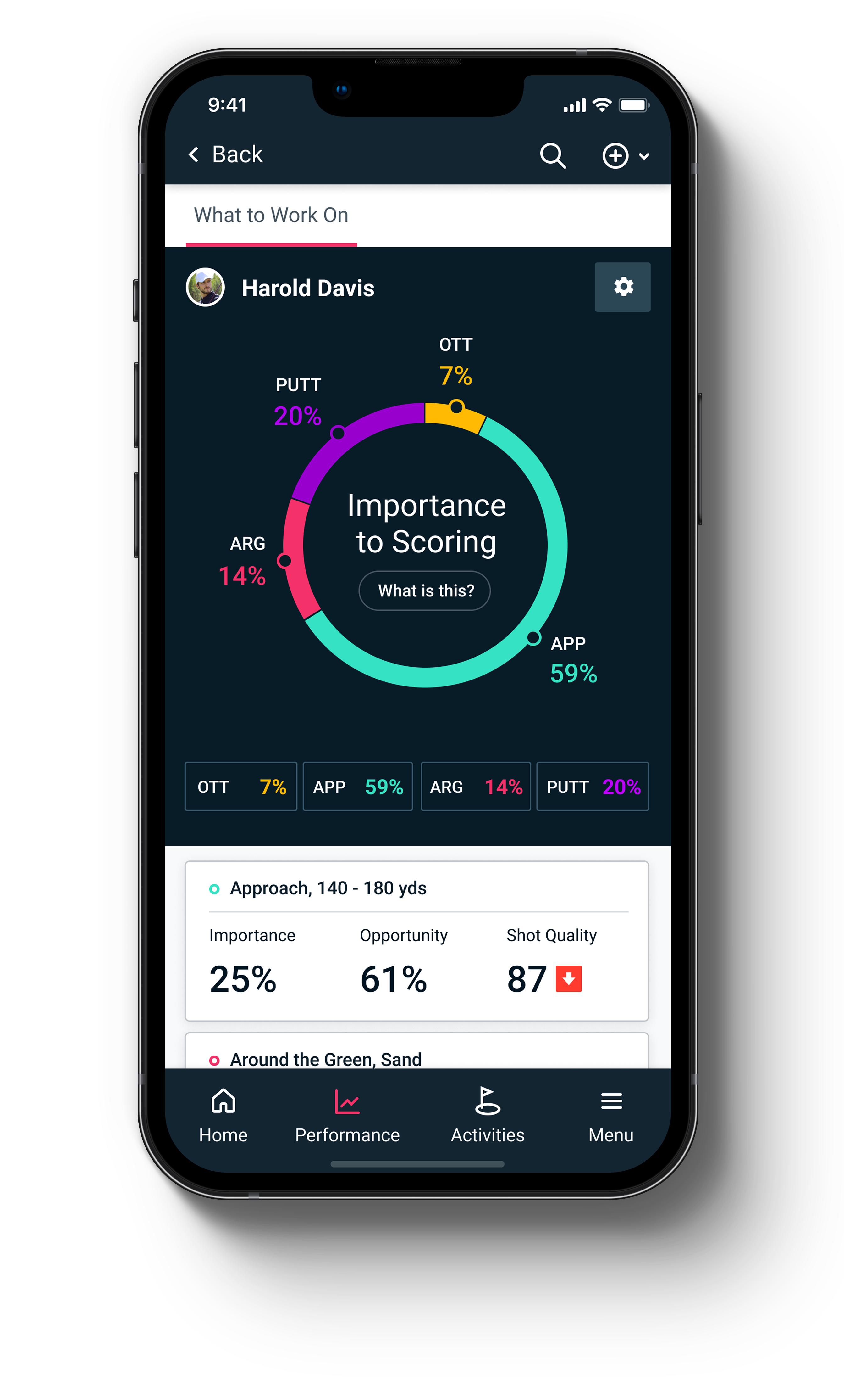 Imagine if you knew which parts of your game to work on in order to produce lower scores. What To Work On tells you exactly that, providing a detailed, data-led view of your game that breaks it down into sub-groups that link closely to a skill.