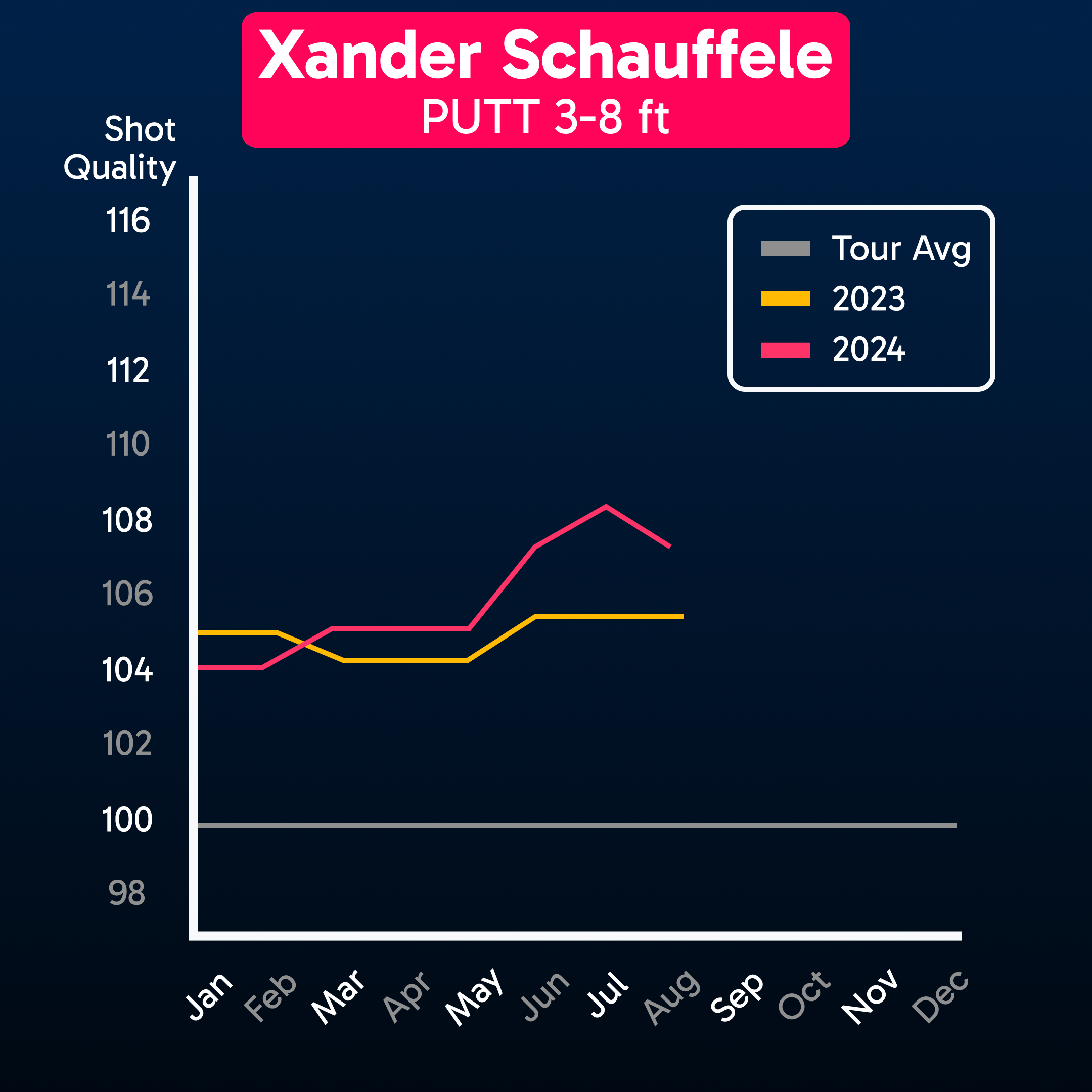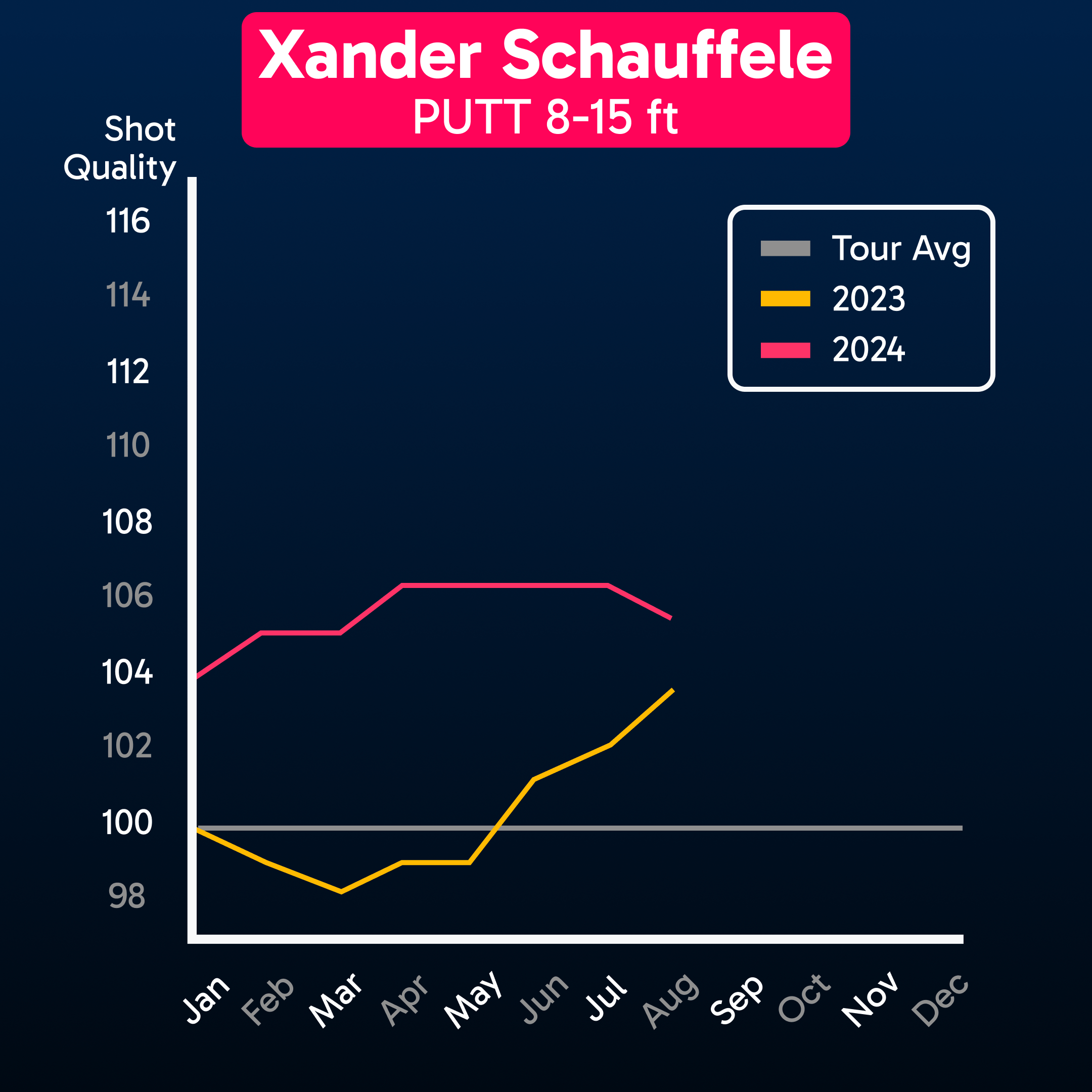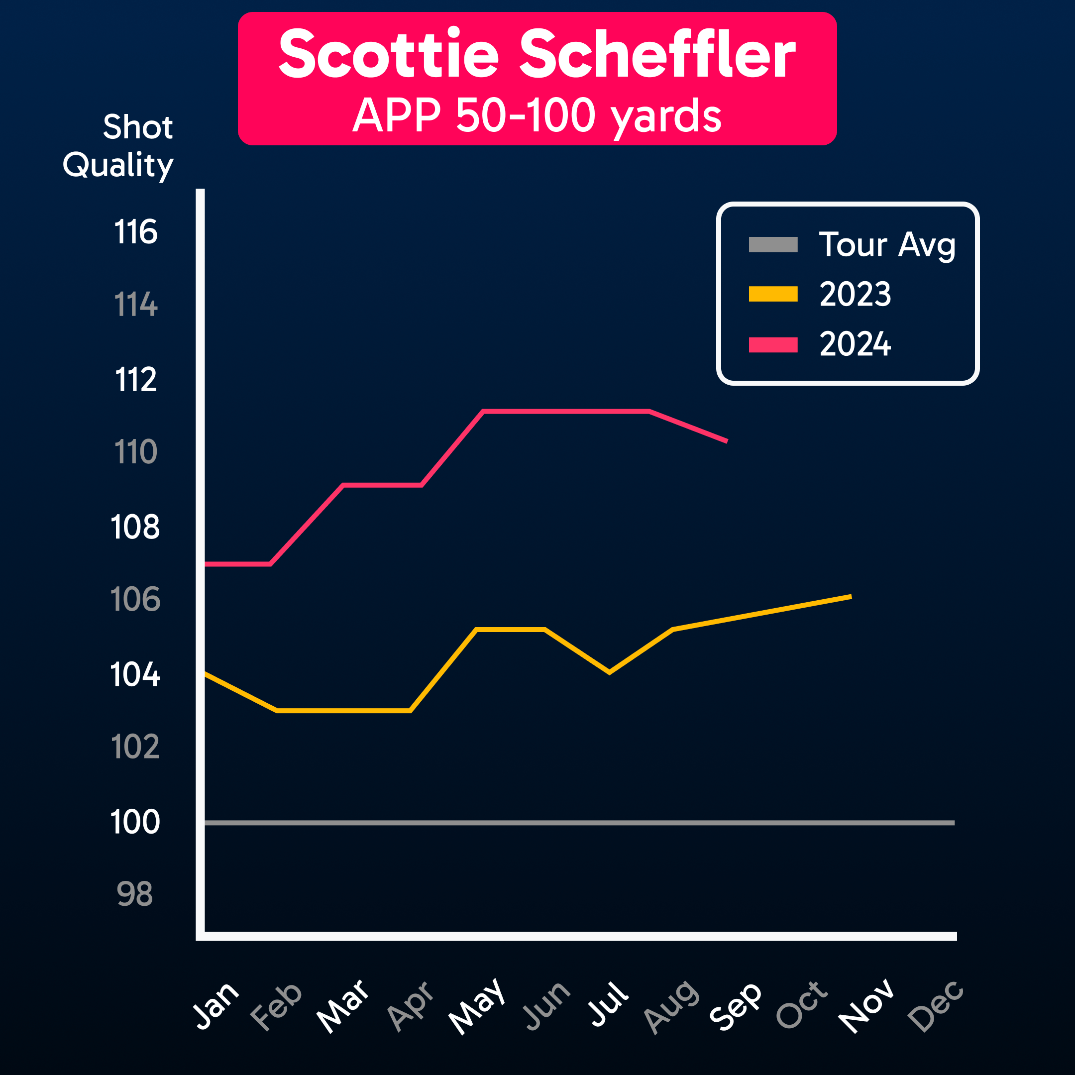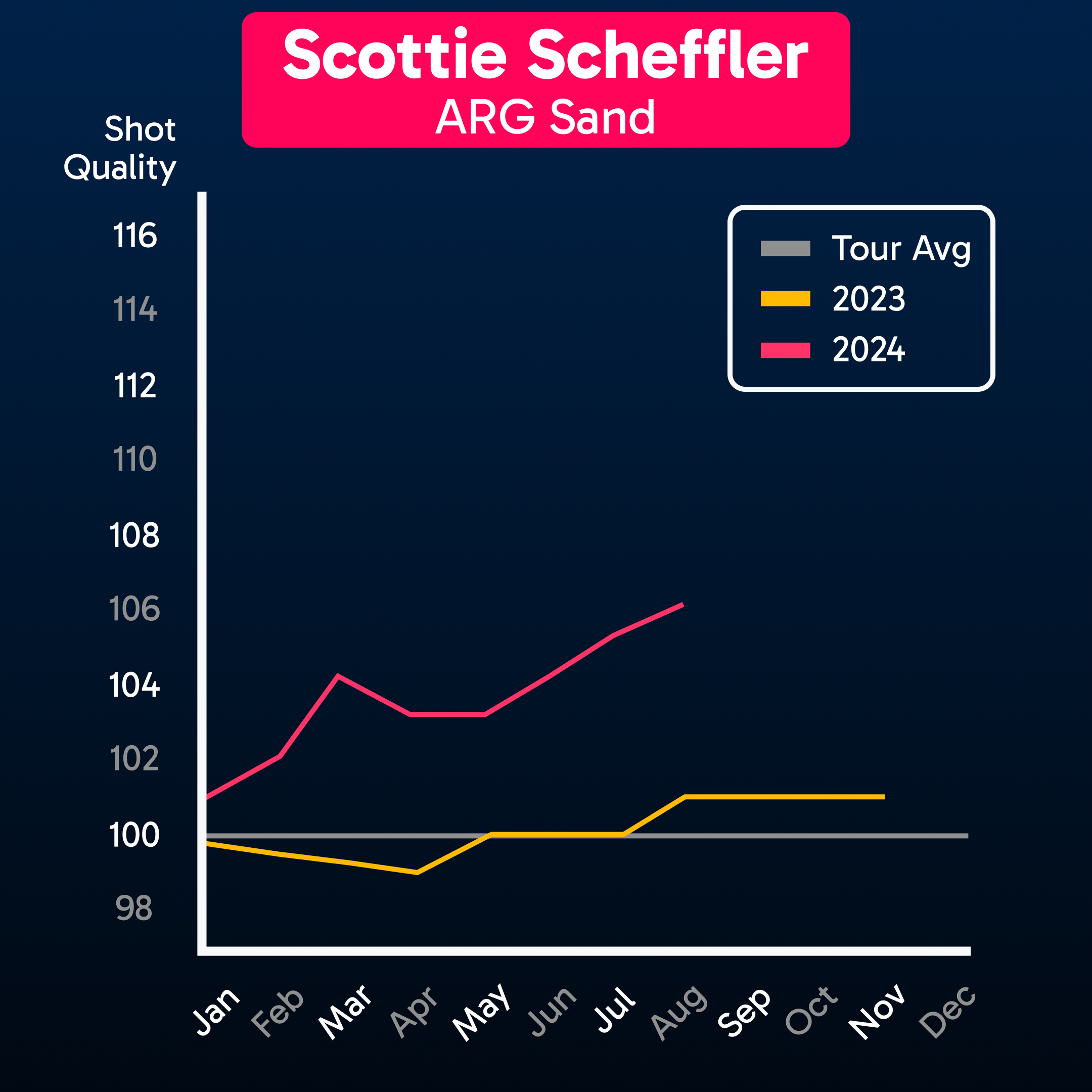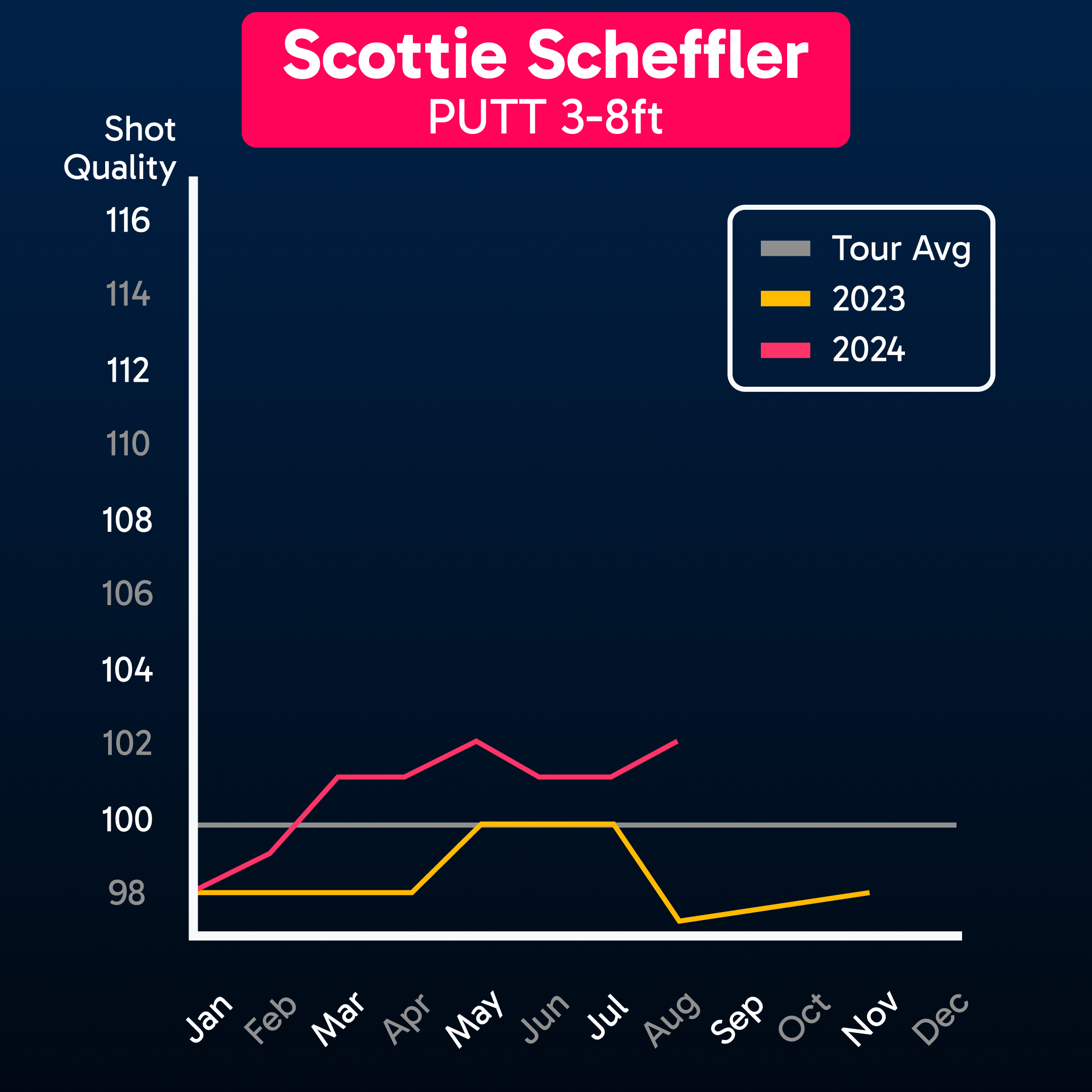 Scheffler's long putting (35ft+) was among the best on tour last season, an example of the Texan turning an already strong part of his game into another weapon. His putting from 3-8ft is still well below the standards he sets in other parts of his game but his Average Shot Quality is now comfortably above average, which given the number of approach shots he fires in to this distance, makes a big difference when the prizes are being handed out.