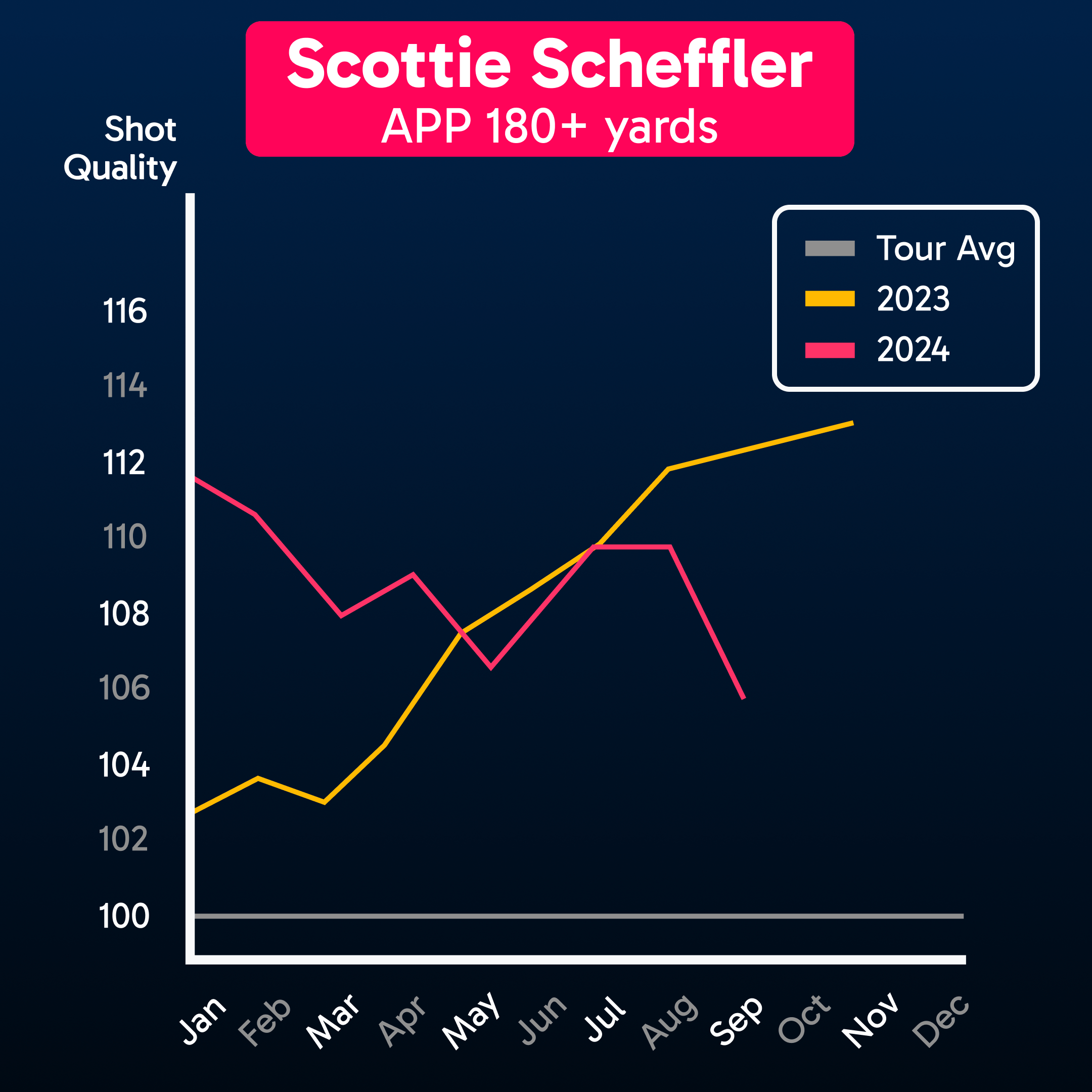 We've picked out six areas of the game that Scottie Scheffler showed marked improvement in. Starting with Scottie's irons in the 180+ yard bracket, we can see he was red hot at the start of the year but had already begun to fade by the time he slipped on his second Green Jacket at Augusta. And by fade, we mean he declined from being out of this world (112 Average Shot Quality) to merely excellent (106 Average Shot Quality), which still makes him comfortably better than most players on the PGA Tour.