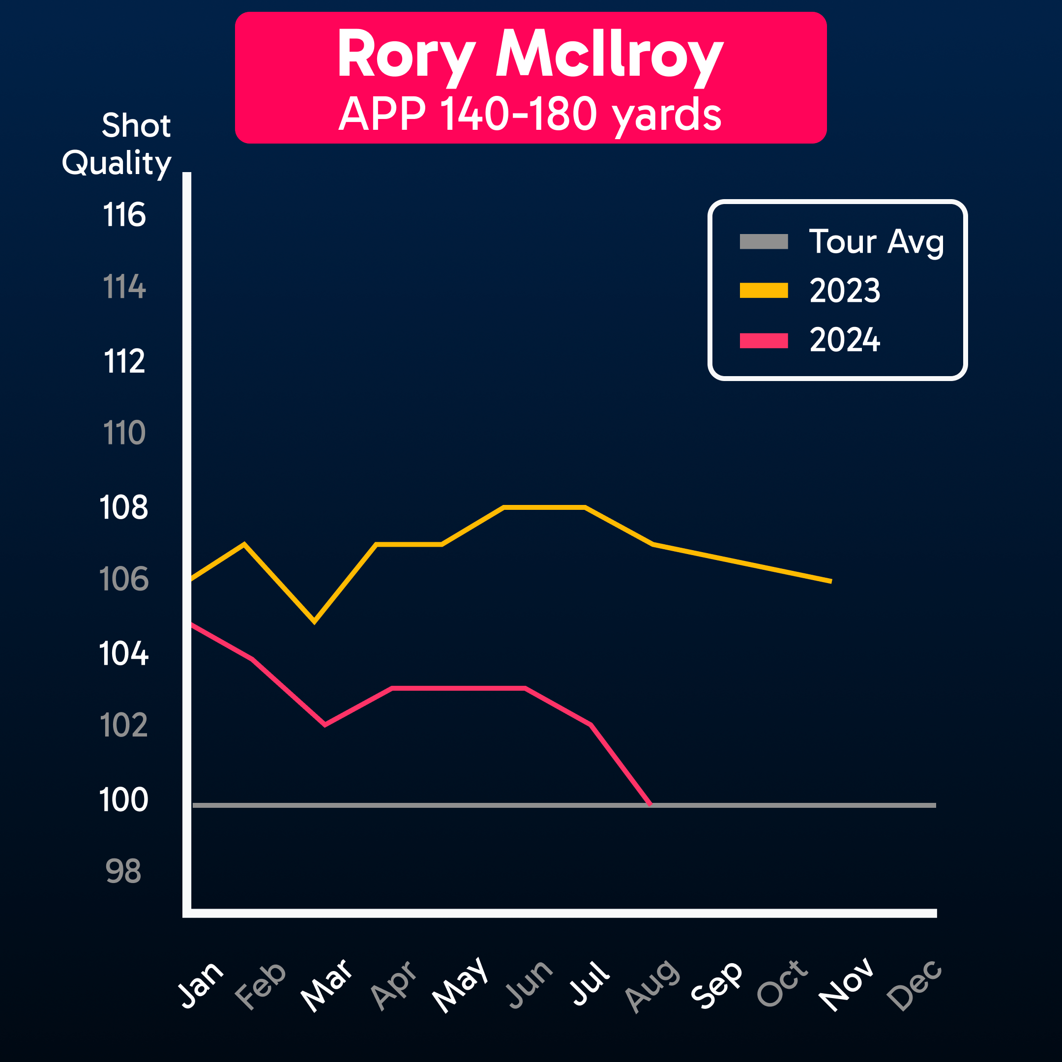 While a season like the one the Ulsterman had in the US would be a cause for celebration for most, it will be remembered as one of near misses at crucial times. In the graphs below we can see three areas of the game where Rory performed at well below the levels he set in 2023.