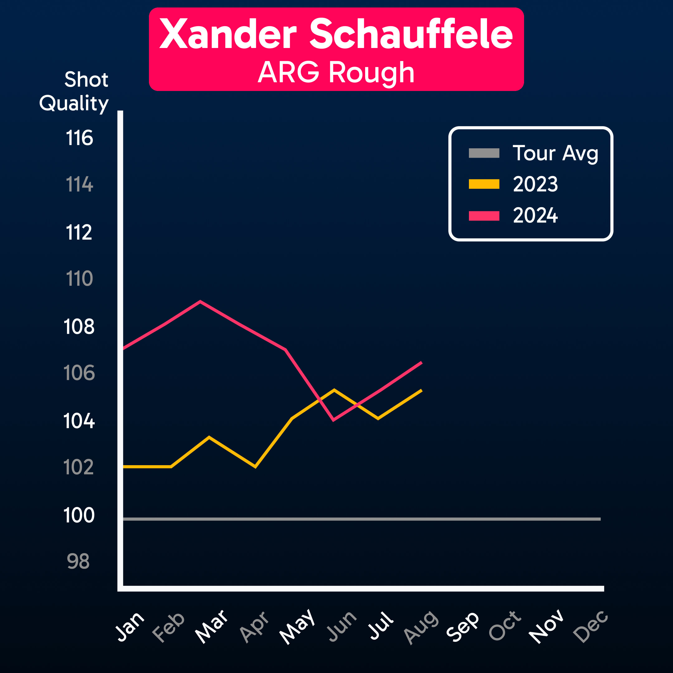 At the beginning of the year his chipping from rough around the green (ARG Rough) was at a similar level to where he was at by the end of the 2023 Tour Championship. It declined slightly through the spring before recovering and serving him well for the rest of the season.